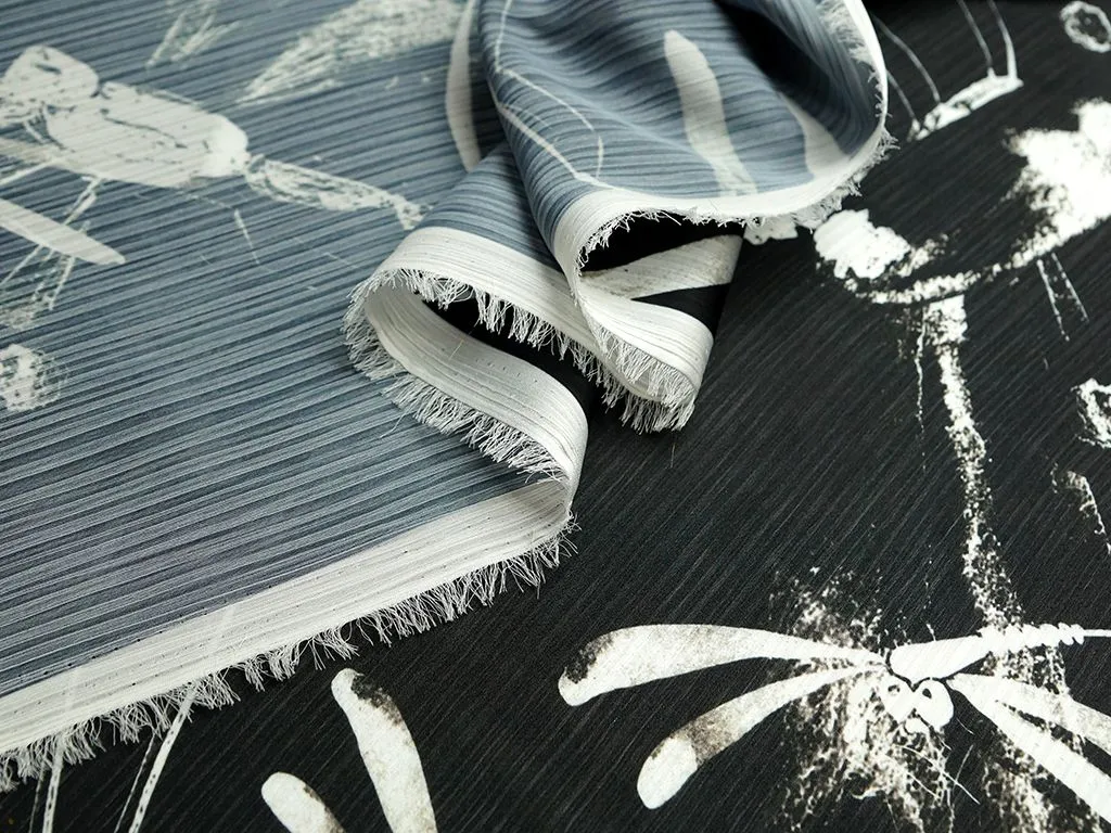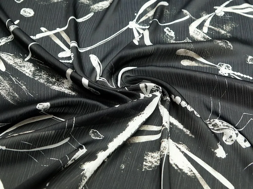 Блузочная ткань с принтом "стрекозы" на черном фоне. Легкая полупрозрачная ткань с эффектом крэш. Прекрасно драпируется, отличается непревзойденной мягкостью. Нежный материал вызывает приятные тактильные ощущения. Очень комфортная, с лицевой стороны ткань с легким блеском, а с изнанки - матовая. Подходит для пошива блузы.