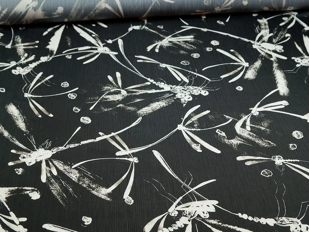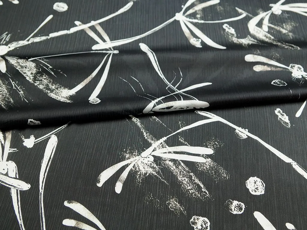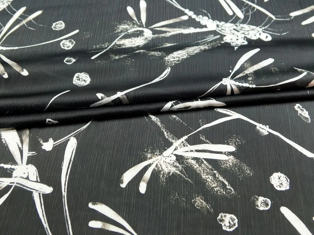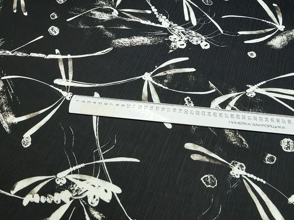 Блузочная ткань с принтом "стрекозы", черно-белый цвет