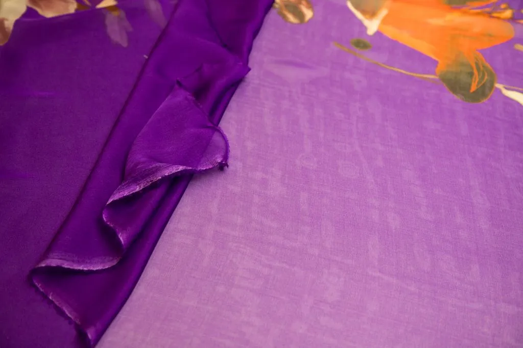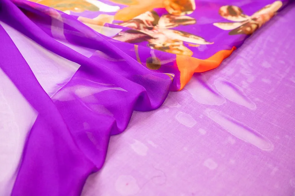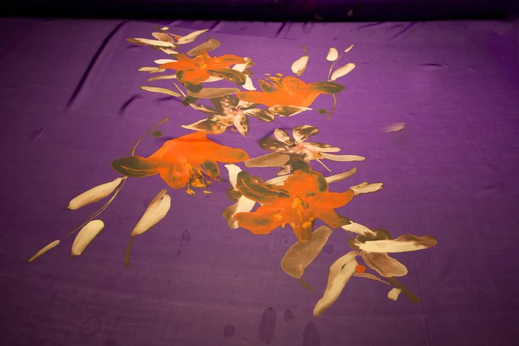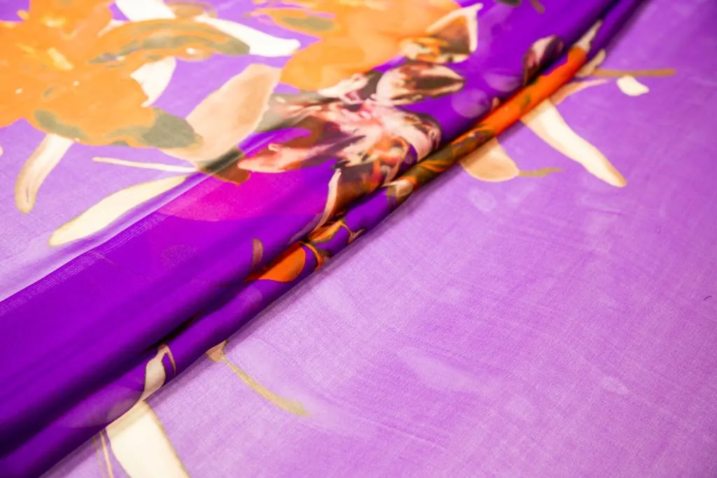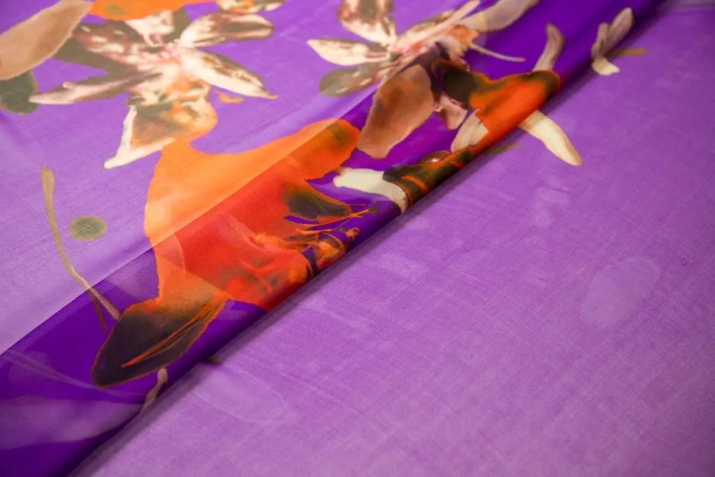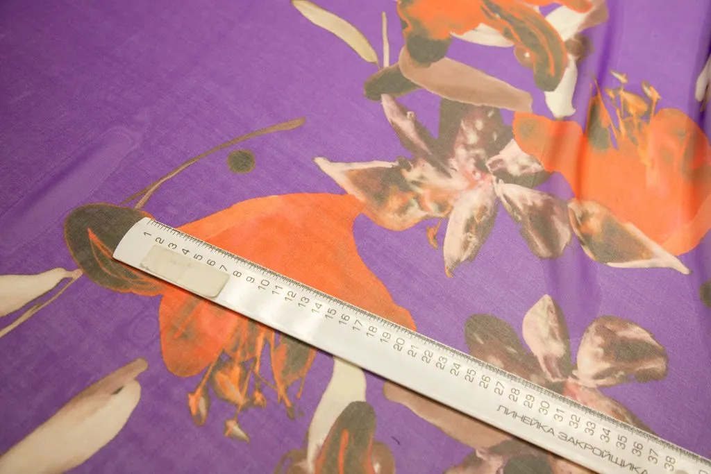 Шифон с рисунком "Лилии", фиолетовый фон, купон 135*140 см