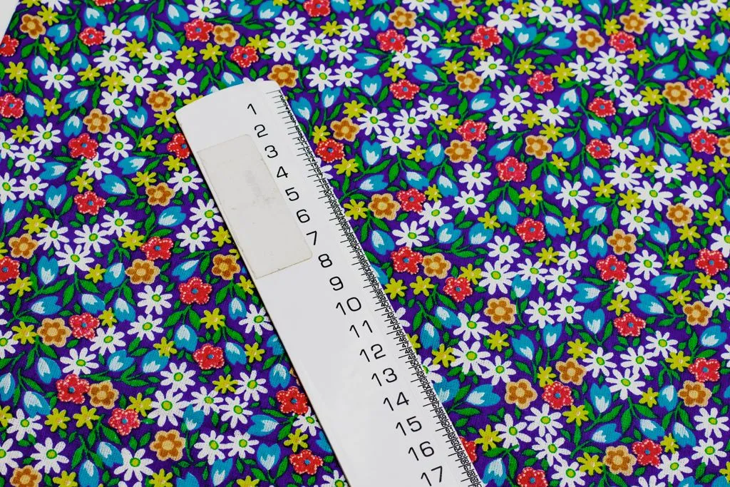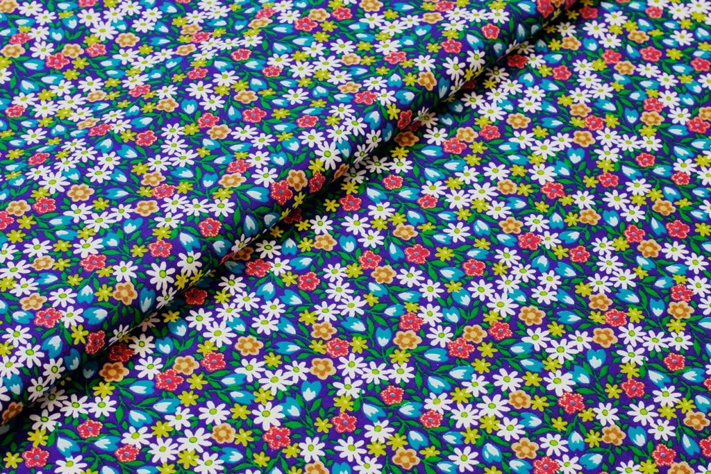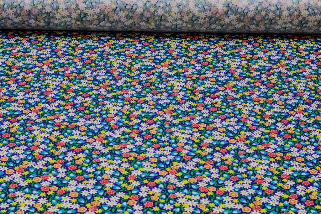 Рубашечно-плательный хлопок с рисунком "Ромашки и тюльпаны" на синем фоне