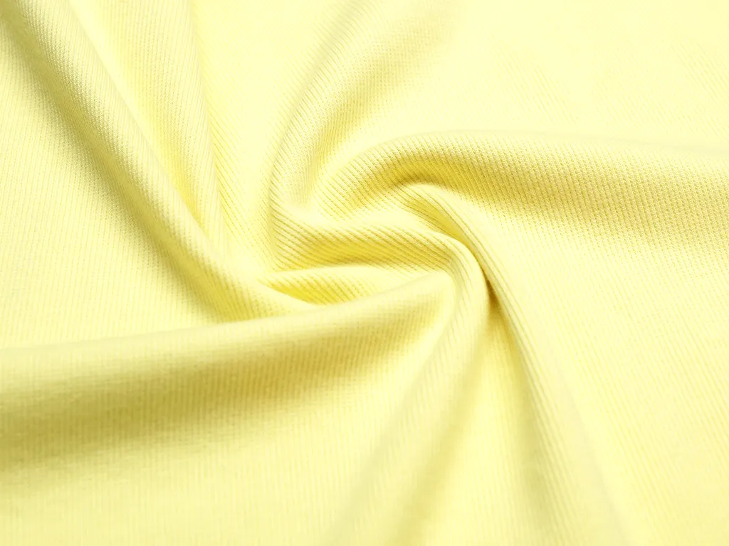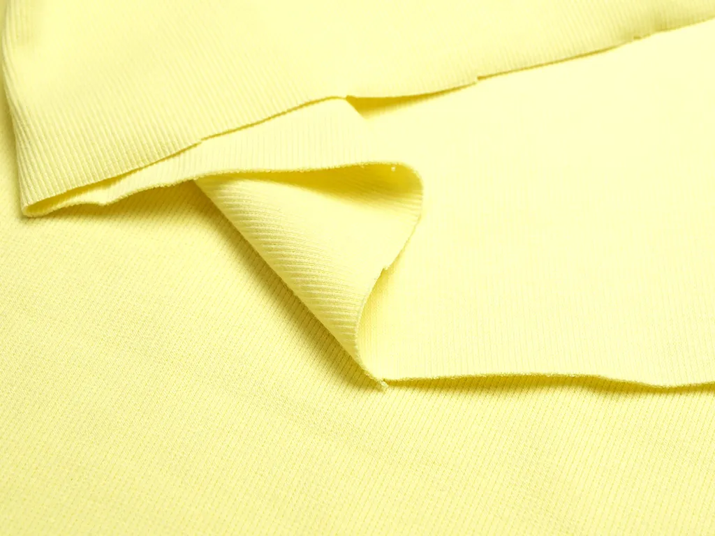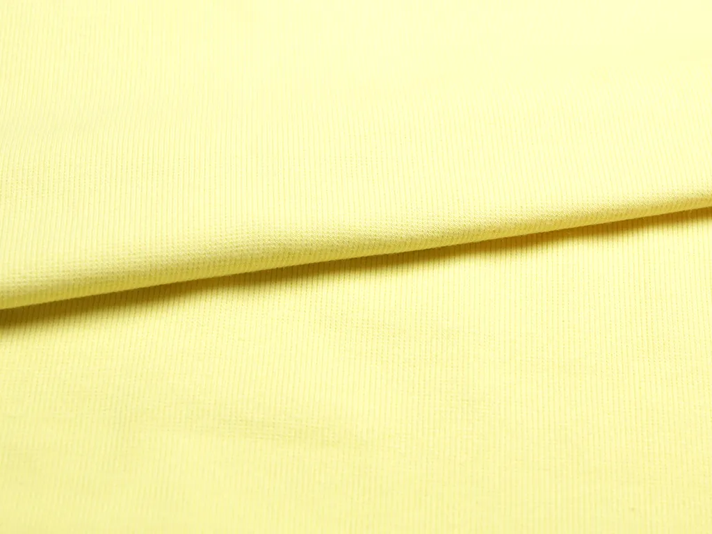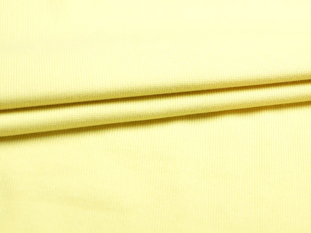 Трикотажный хлопковый материал (кашкорсе) светло-желтого цвета достаточно плотный, но при этом приятный и мягкий на ощупь. Трикотаж экологичен, эластичен, достаточно прочный, стойкий к износу, не садится и не линяет, при растяжении возвращается в исходную форму. Идеально подходит для пошива одежды для дома, штанов, пижам, шапок и для отделки манжетов и воротов.