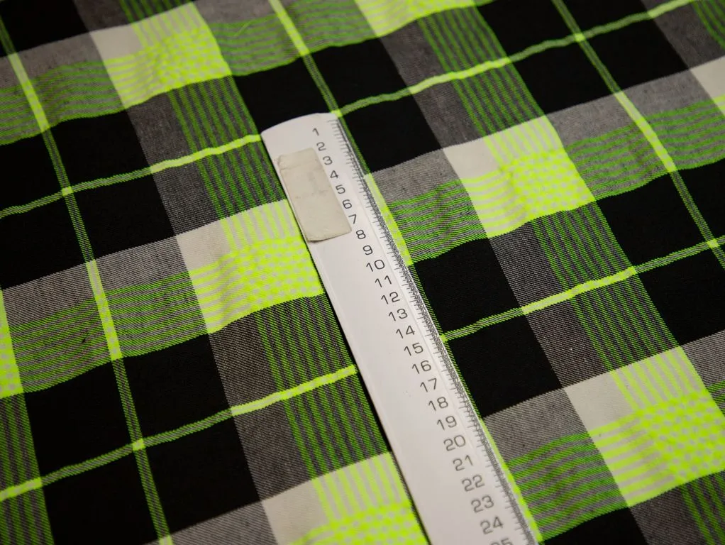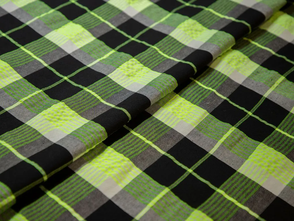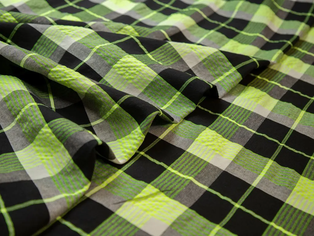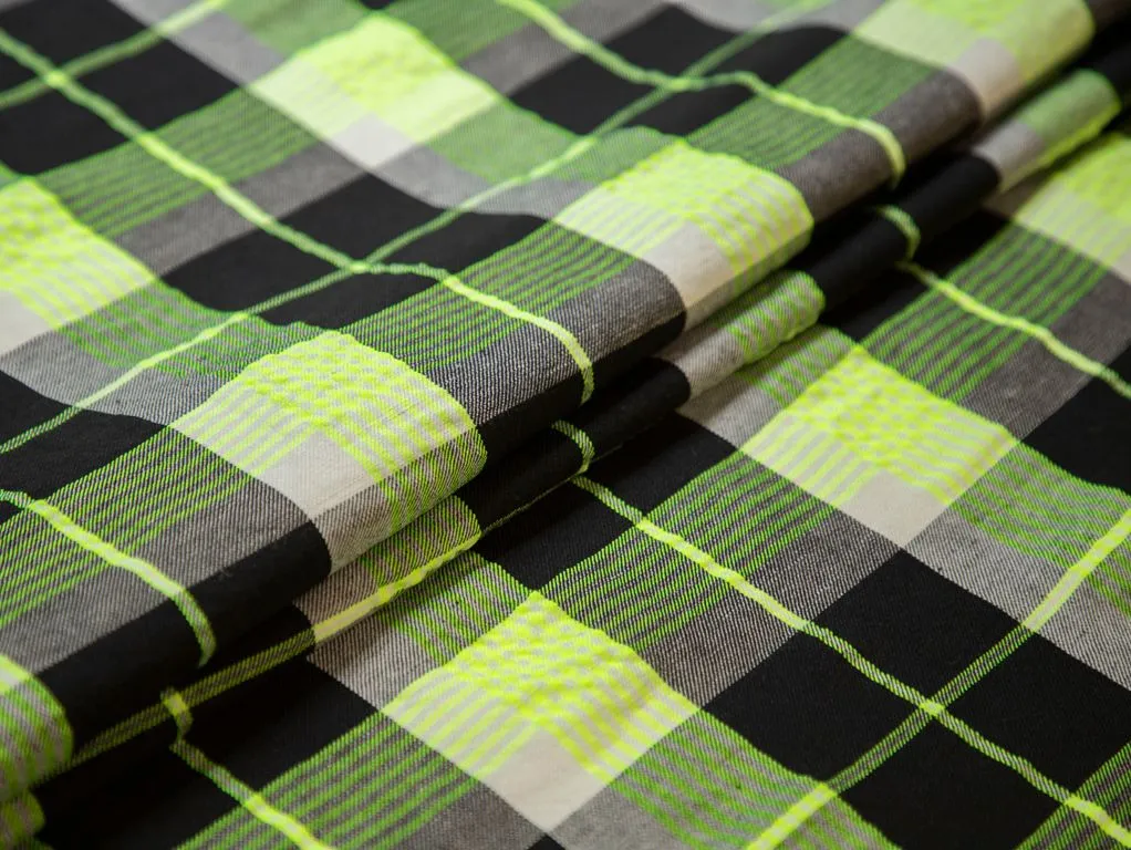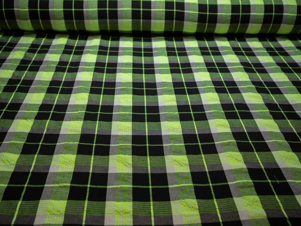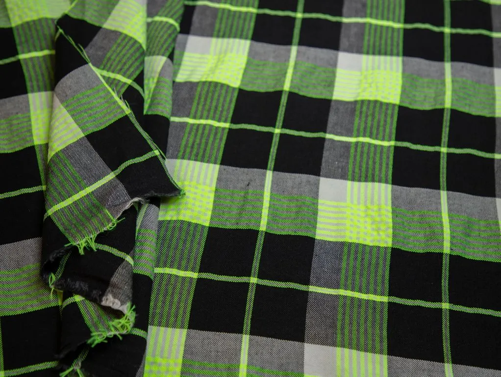 Костюмно-плательная ткань в крупную клетку, неоново-зеленый на черно-белом фоне