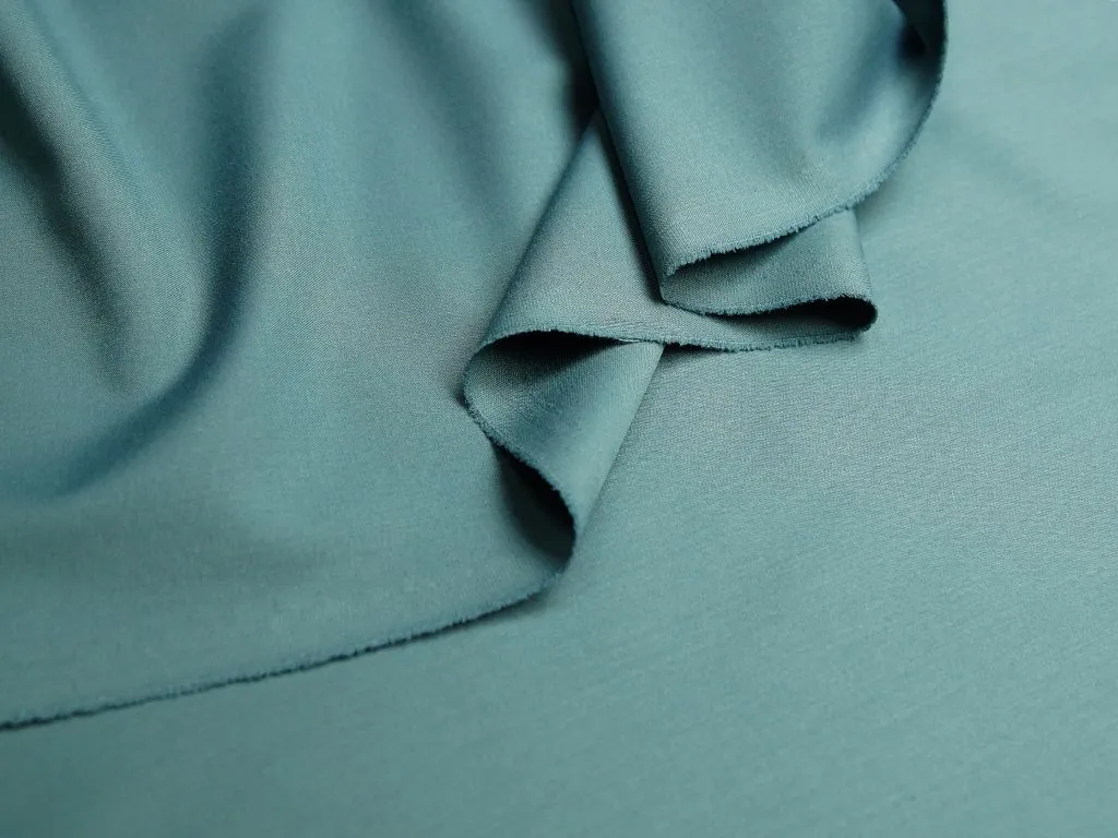 Легкая костюмно-плательная ткань из поливискозы с добавлением эластана, цвет серый с мятным подтоном. Материал тактильно очень приятный и мягкий, тонкий по плотности, с низкой сминаемостью и хорошо драпируется. Подойдет для пошива офисной и повседневной одежды, особенно в летний сезон: костюмы, платья, брюки, шорты, юбки и жакеты.