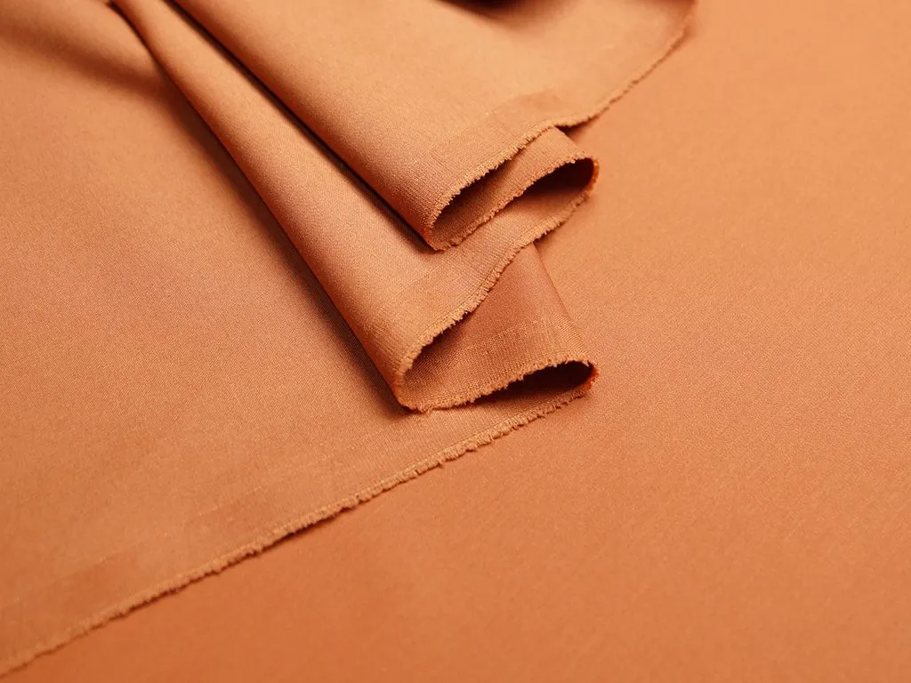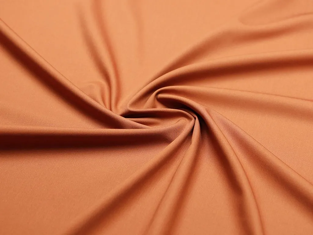Легкая костюмно-плательная ткань из поливискозы с добавлением эластана, цвет теплый коричневый. Материал тактильно очень приятный и мягкий, тонкий по плотности, с низкой сминаемостью и хорошо драпируется. Подойдет для пошива офисной и повседневной одежды, особенно в летний сезон: костюмы, платья, брюки, шорты, юбки и жакеты.