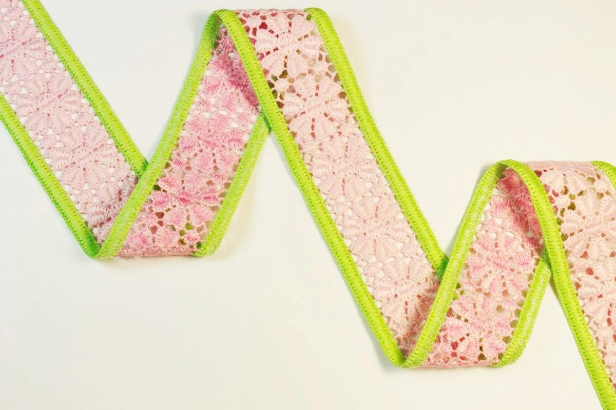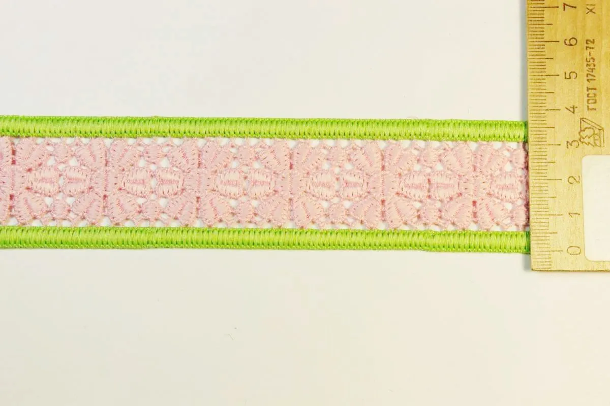 Лента лампасная кружевная, розовое кружево с салатовым кантом, ширина 37 мм.
