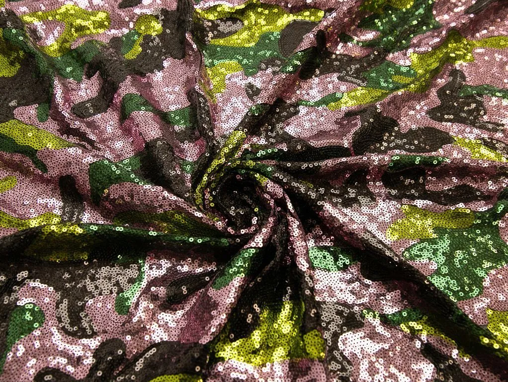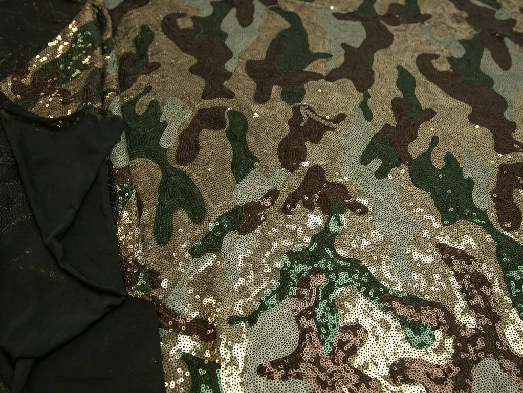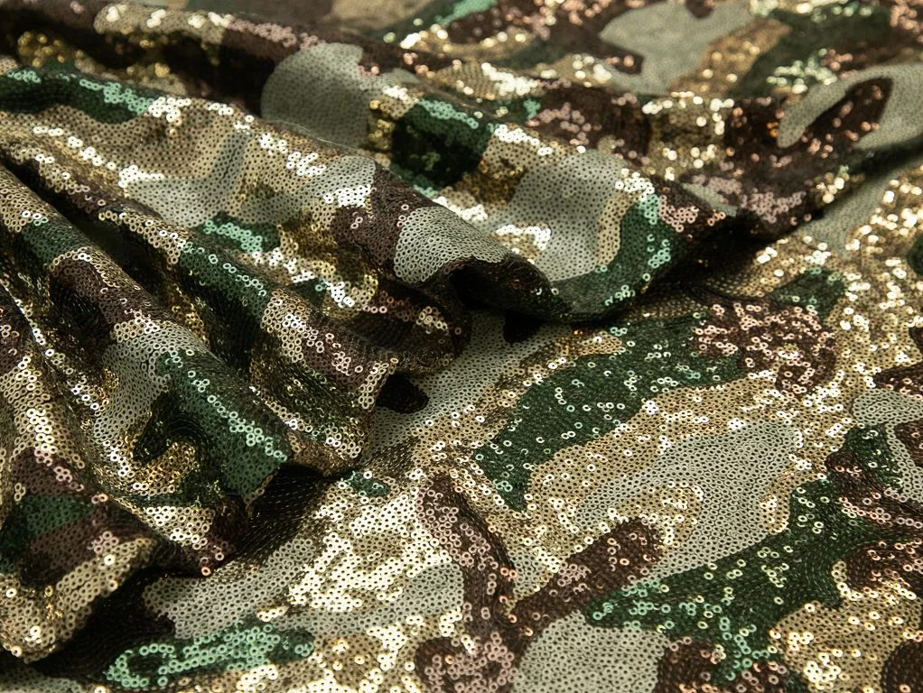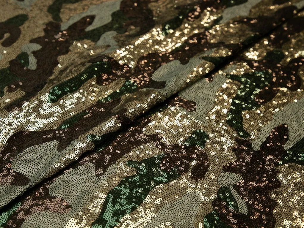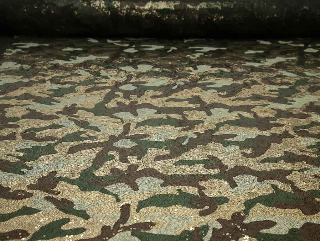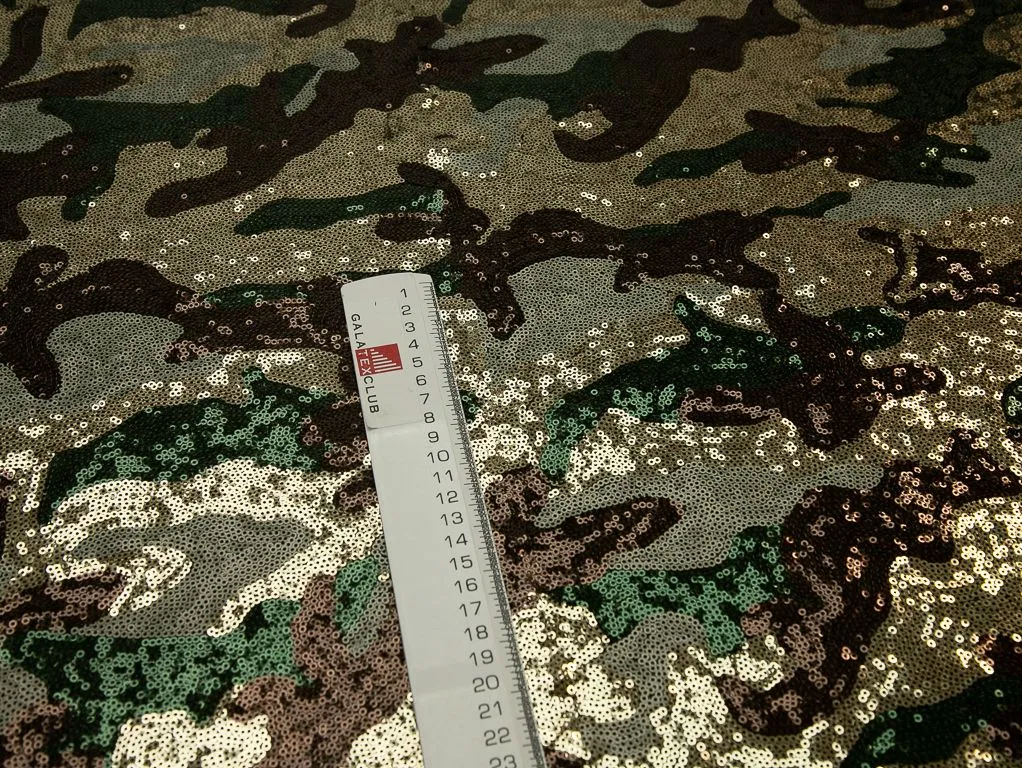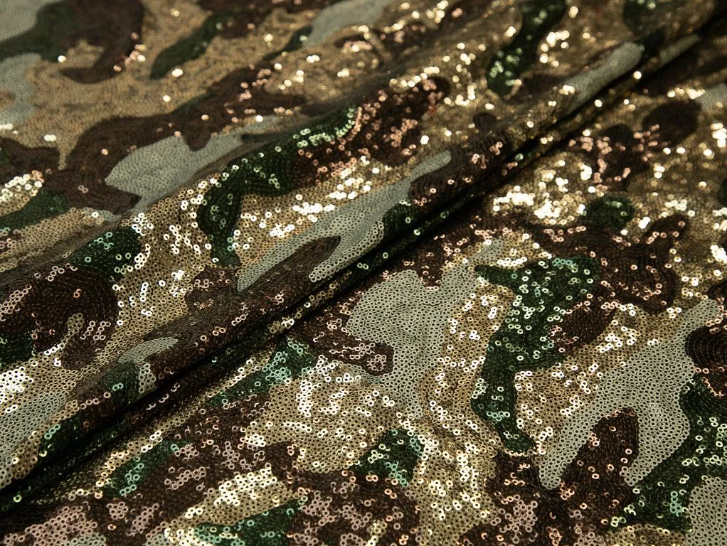 Ткань плательная с пайетками с абстрактным рисунком в зелено-коричневых тонах