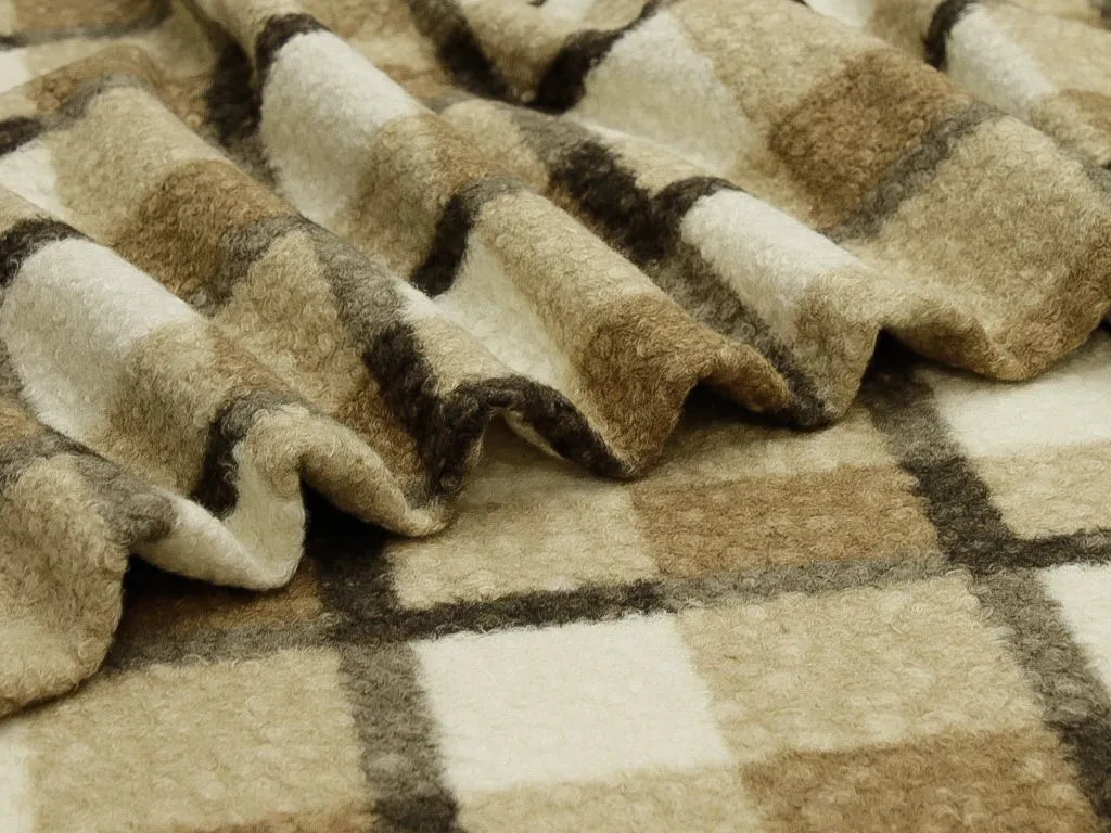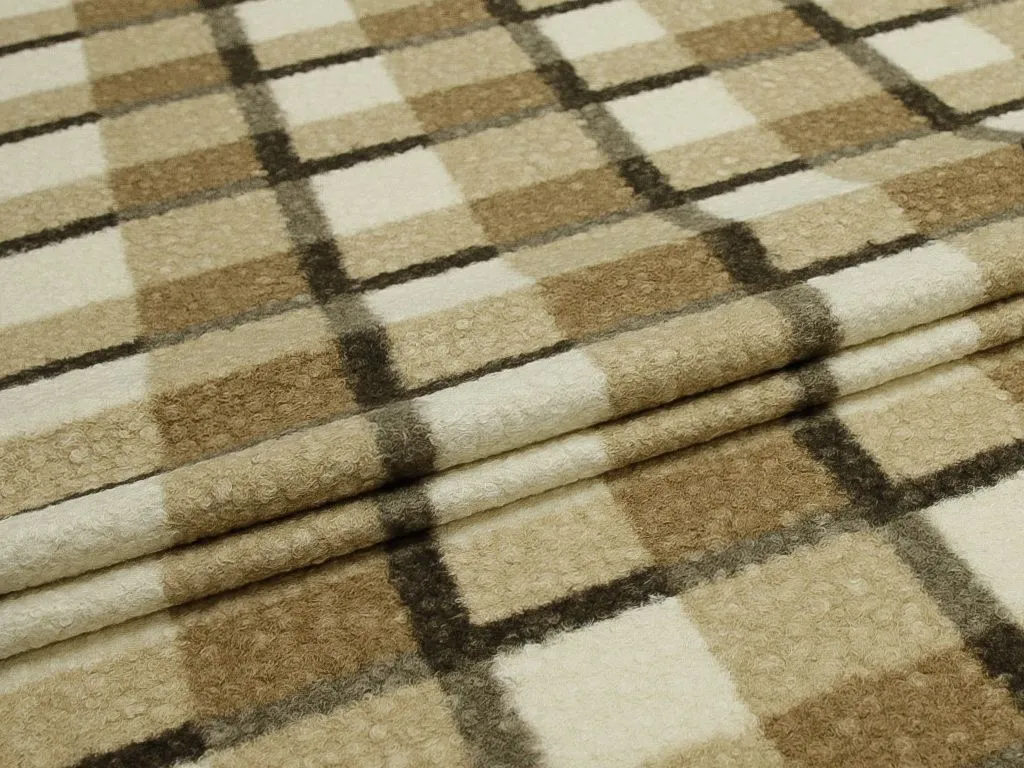 Пальтовая ткань, с текстурой "Барашек", в бежево-коричневую клетку