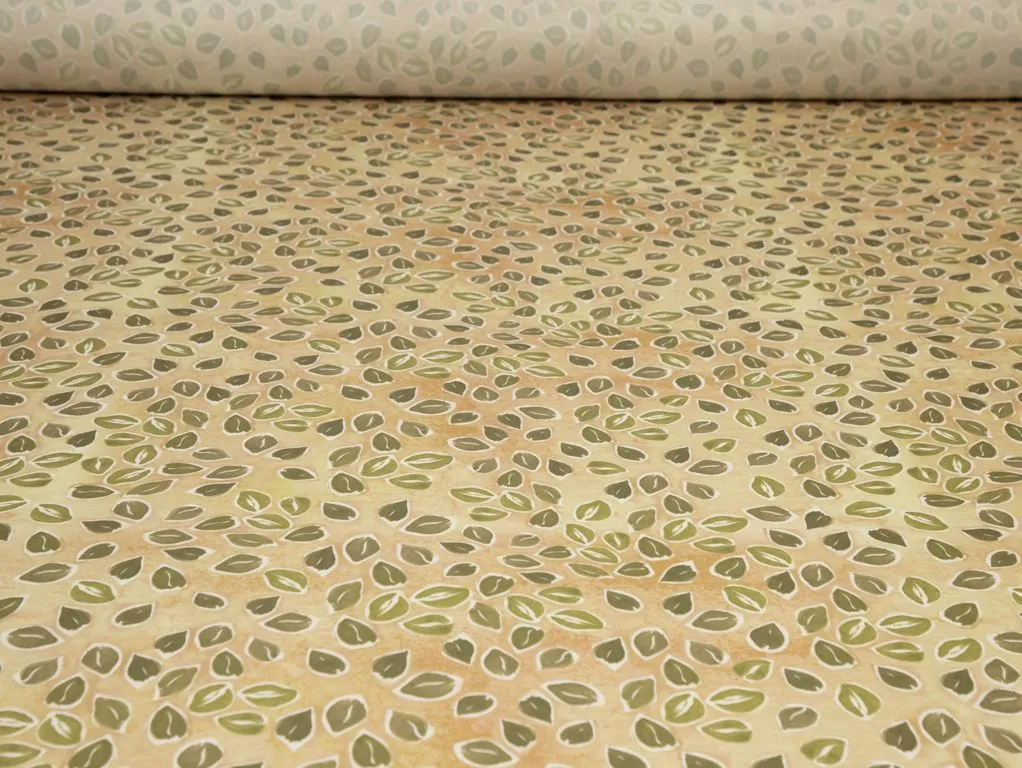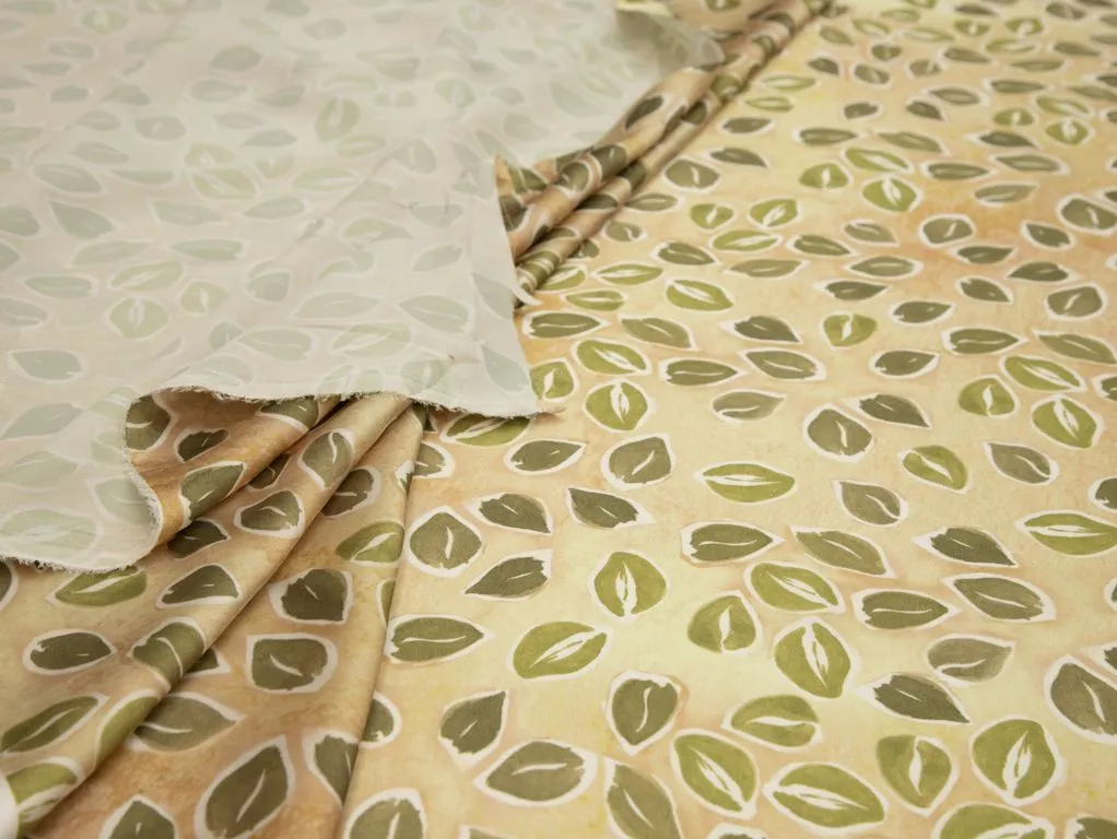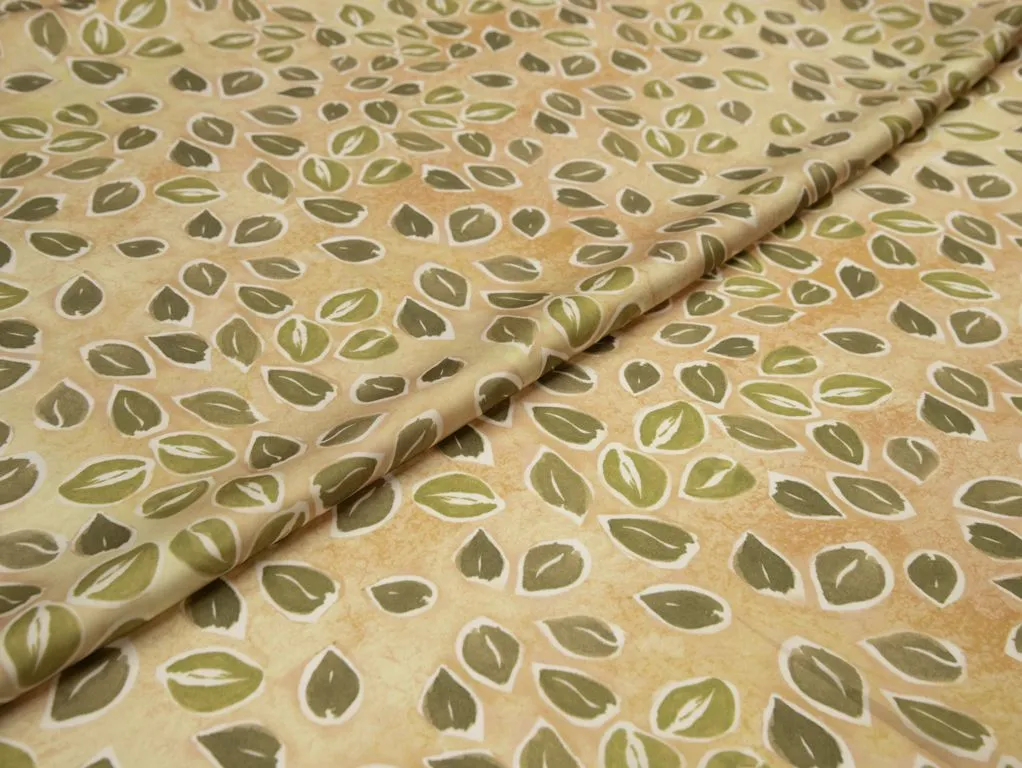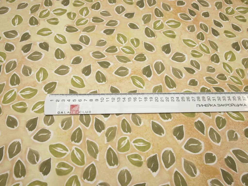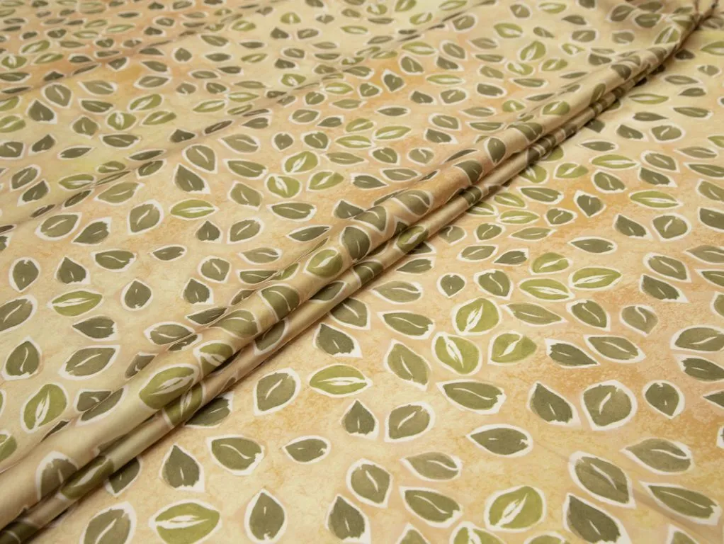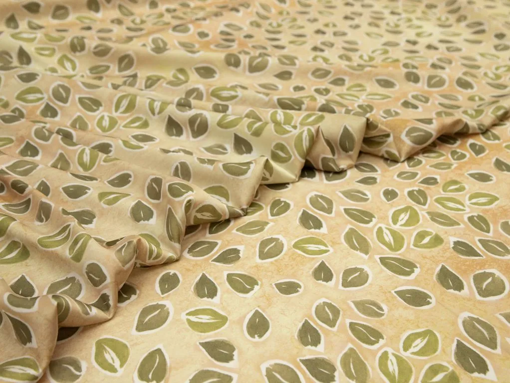 Блузочно-плательная ткань с рисунком "листики", цвет бежево-зеленый