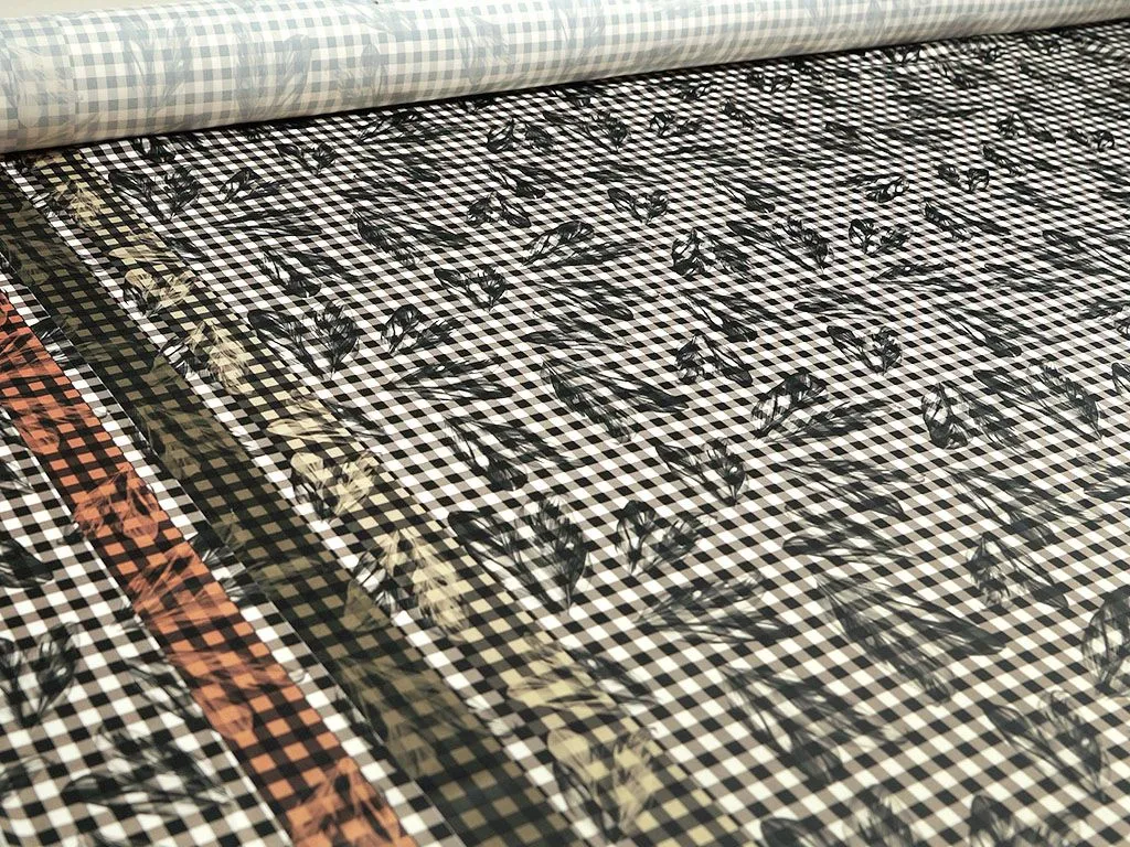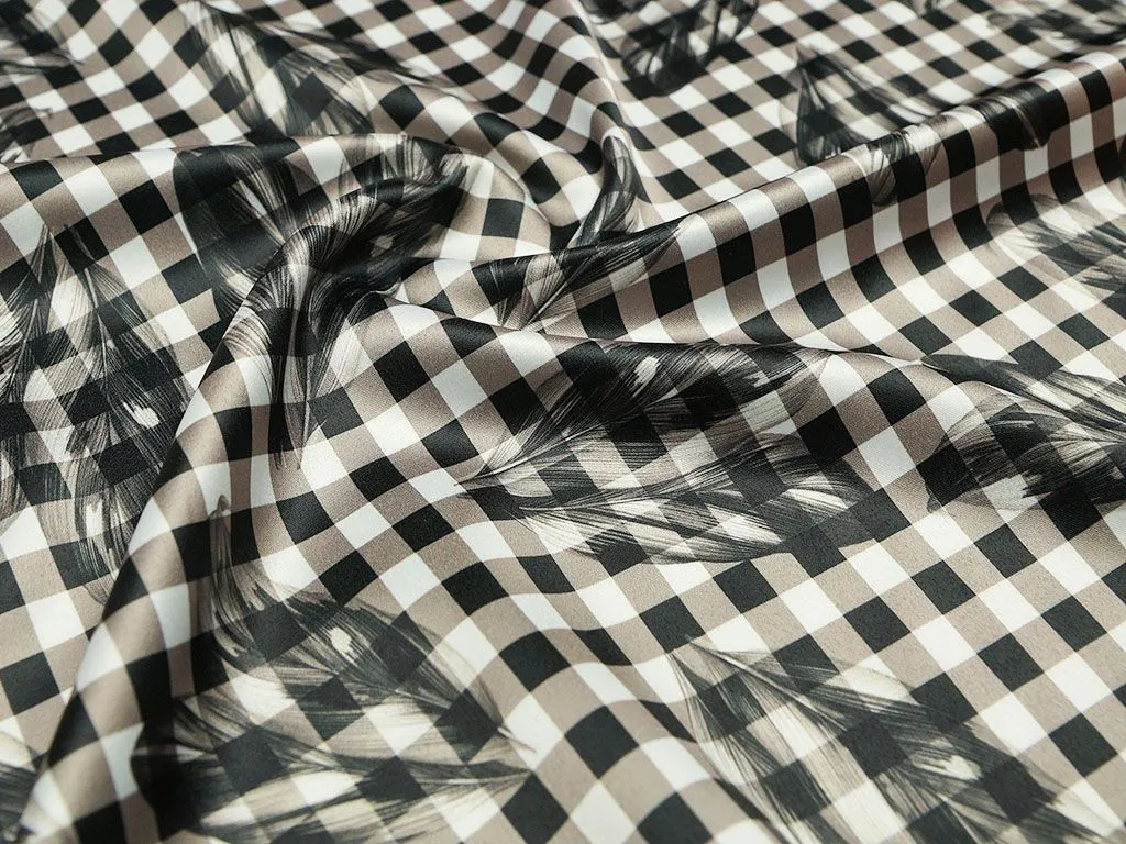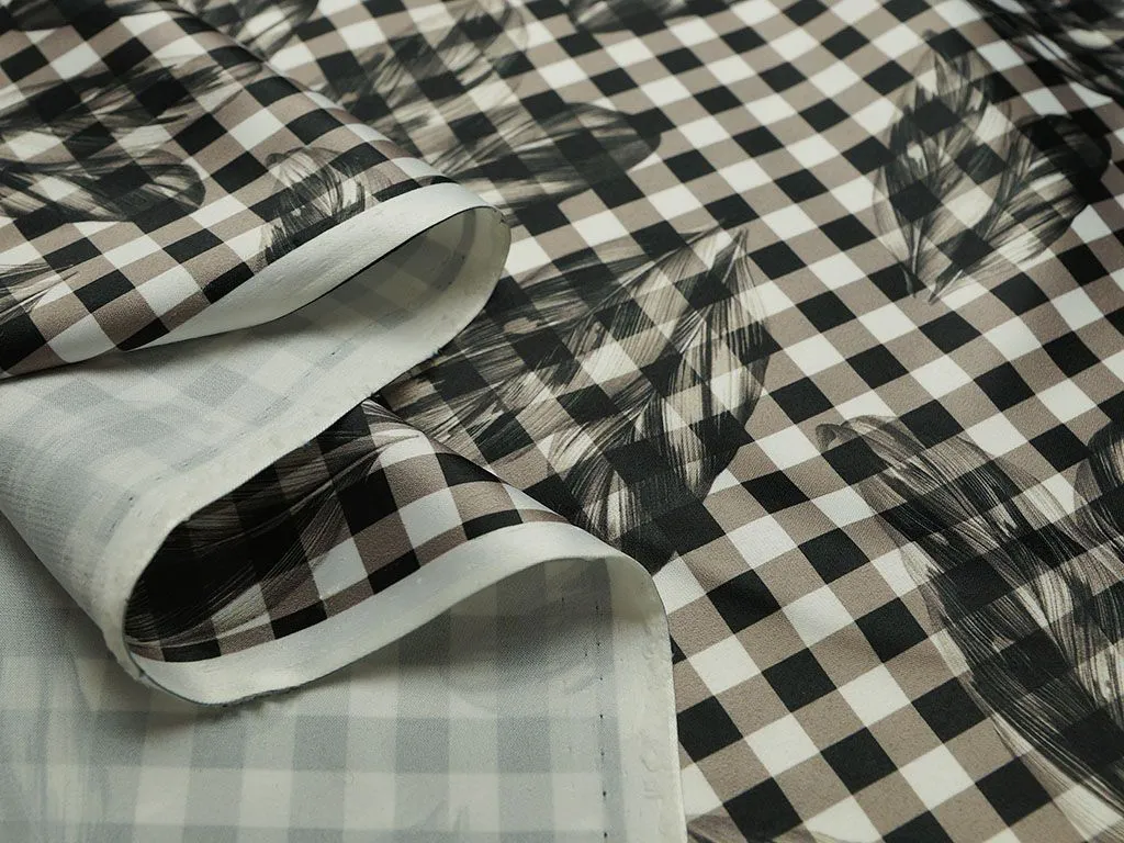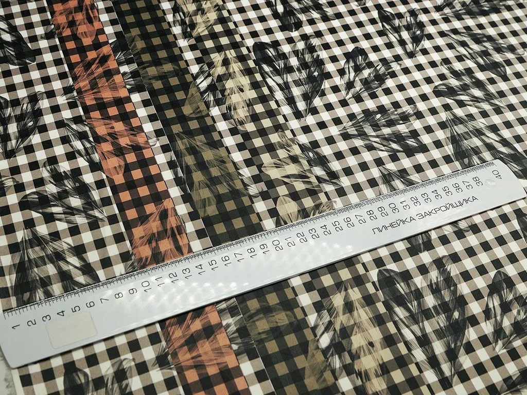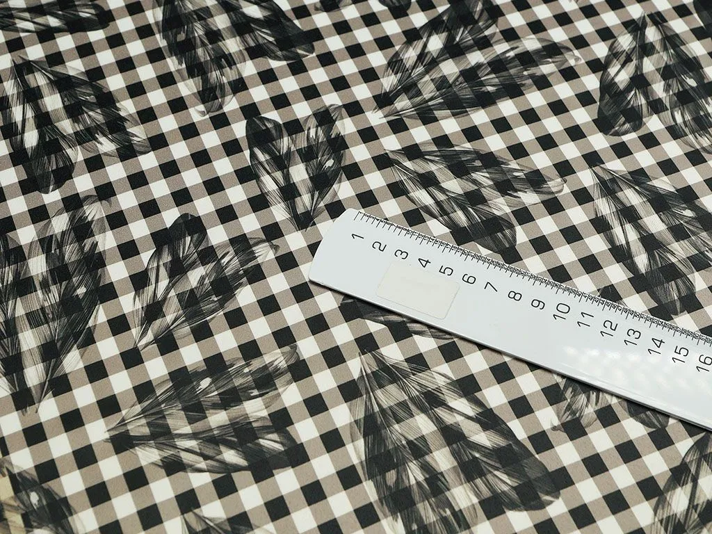Черно-белая плательная ткань в клетку, принт перья (190 г/м2)
