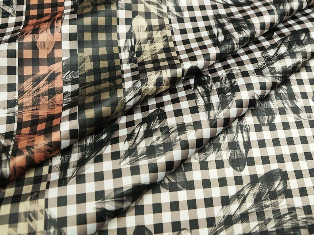 Искусственный шелк с эластаном, в черно-белую клетку. По всему полотну принт перья и только с одной стороны вдоль кромки три полосы разных цветов шириной 4 см. Приятный на ощупь, пластичный, не электризуется, комфортен в ношении и уходе. Может быть как для повседневной одежды, так и для нарядного вечернего платья.
