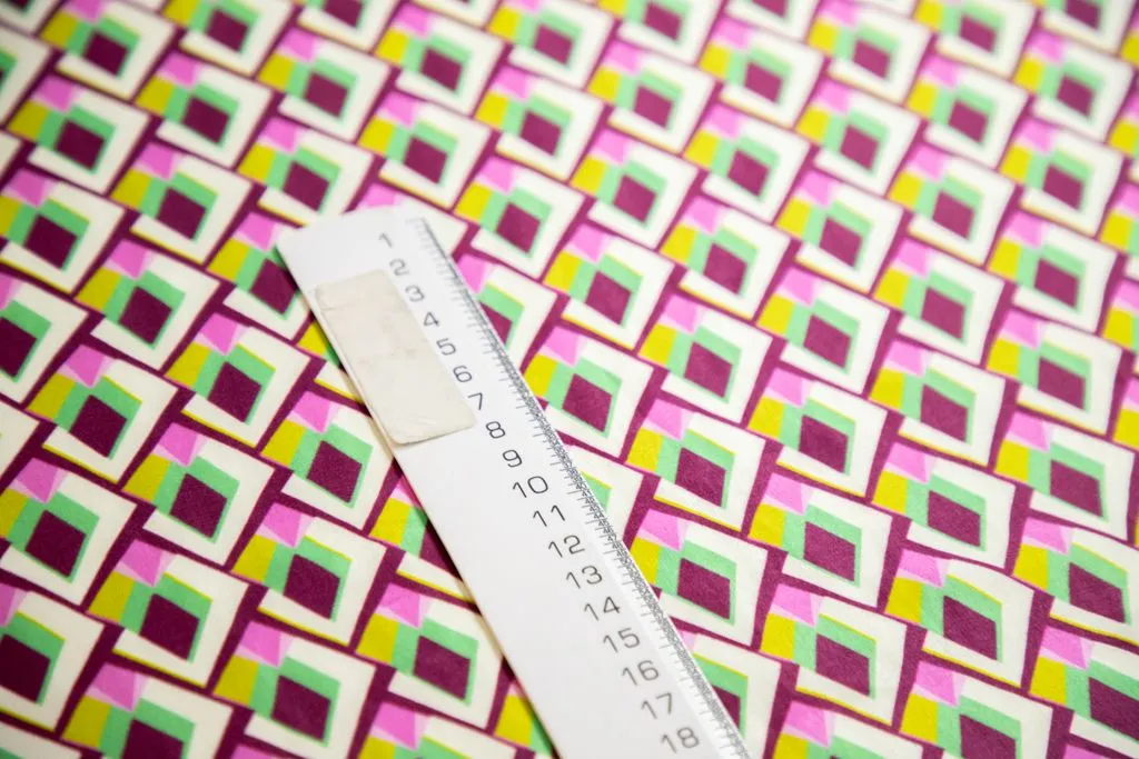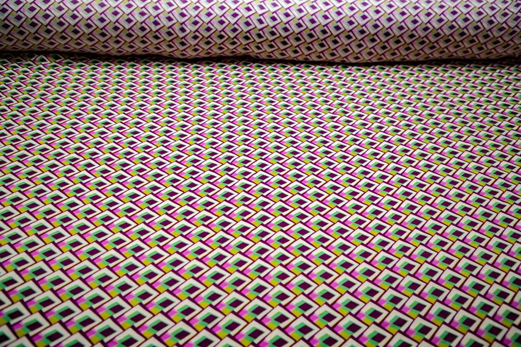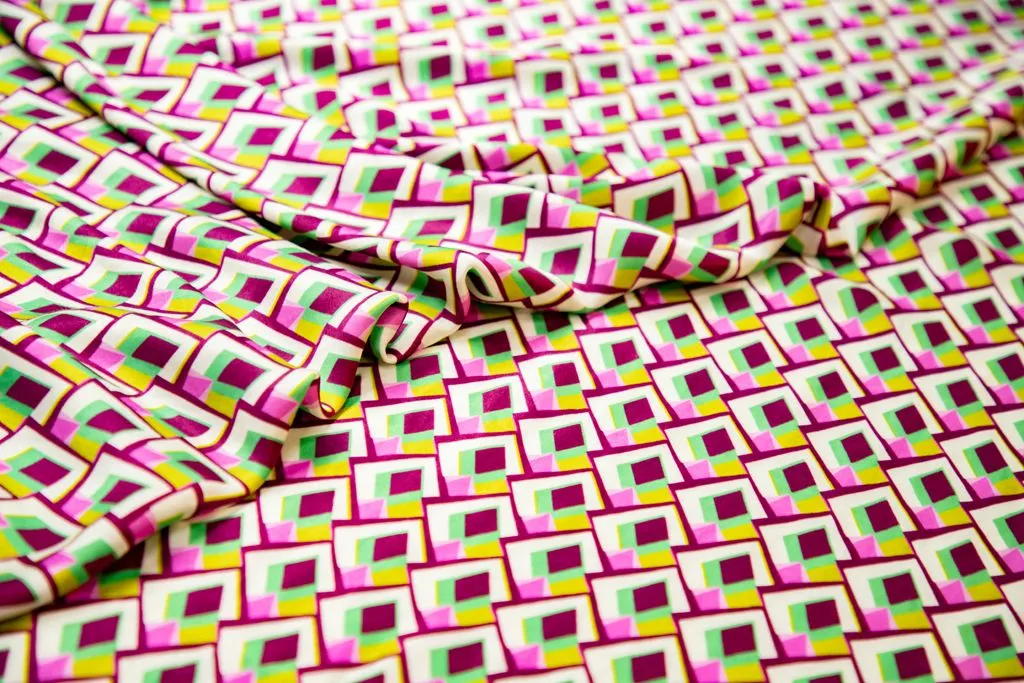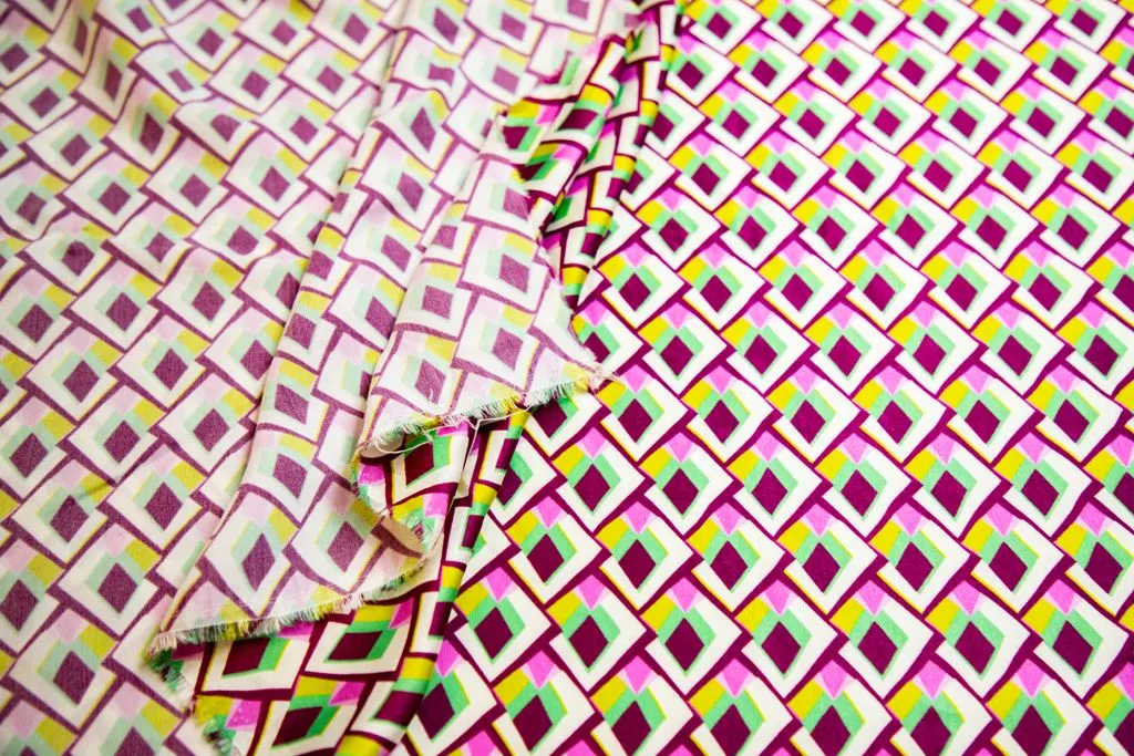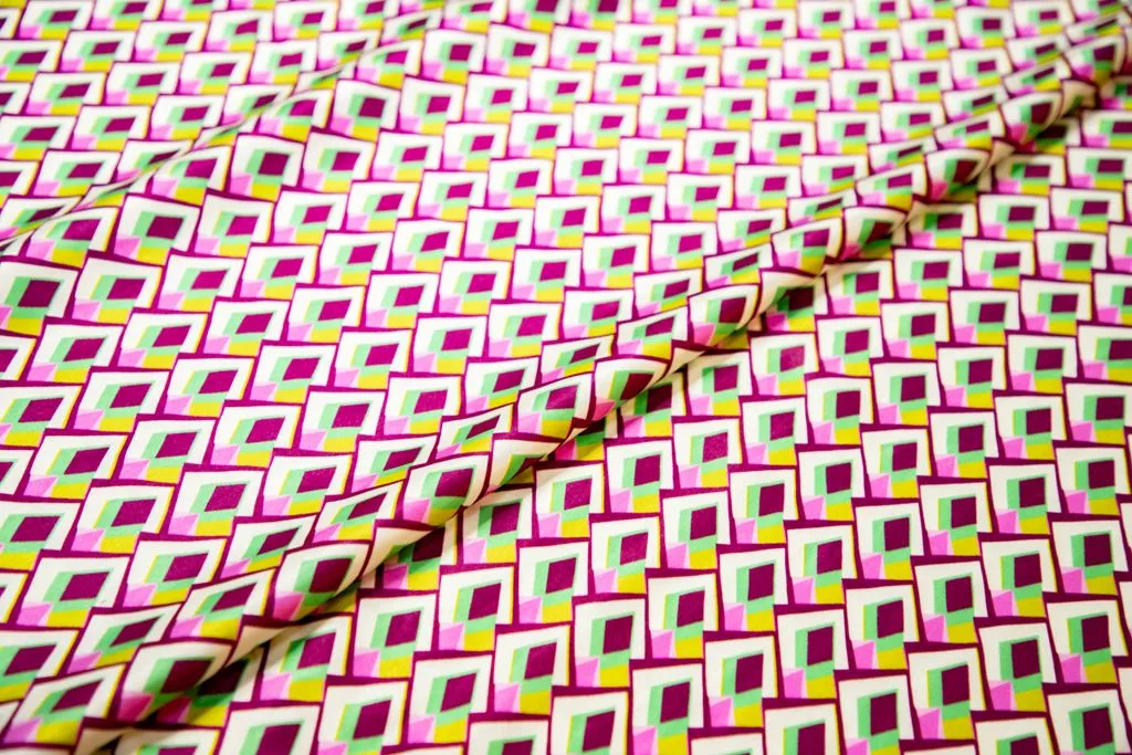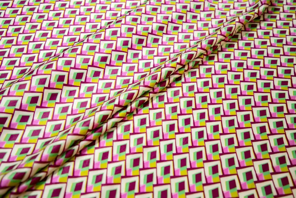Плательная ткань с абстрактным геометрическим рисунком, в розово-зеленых цветах