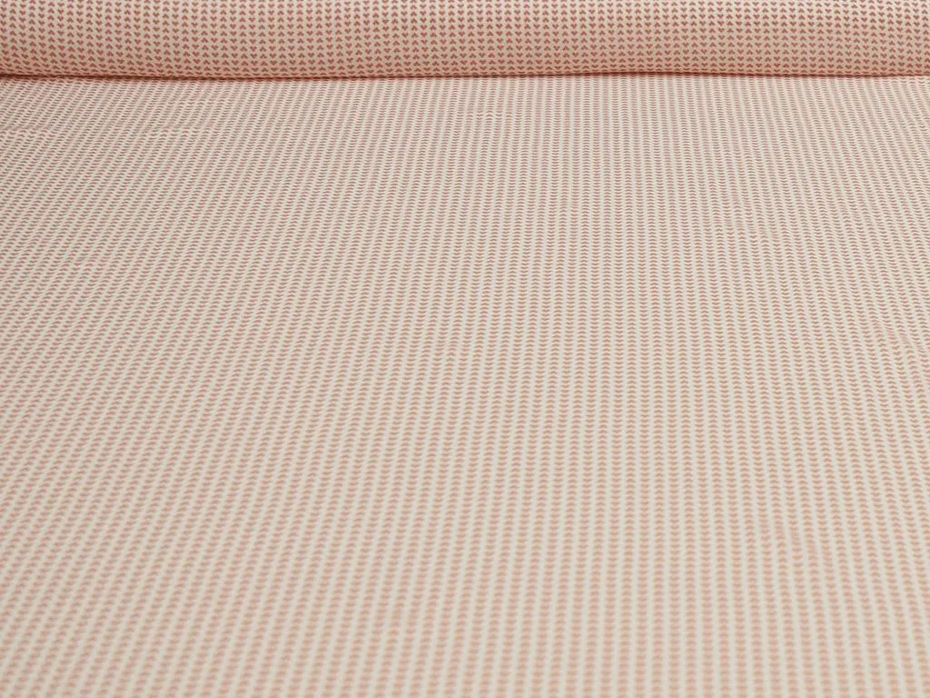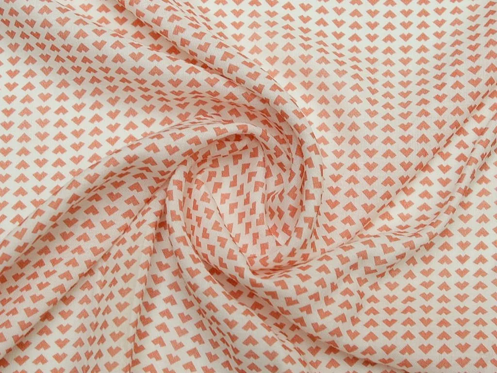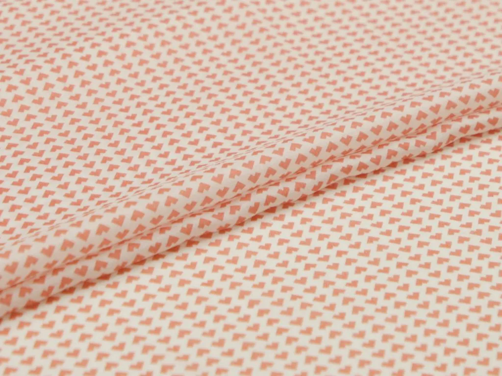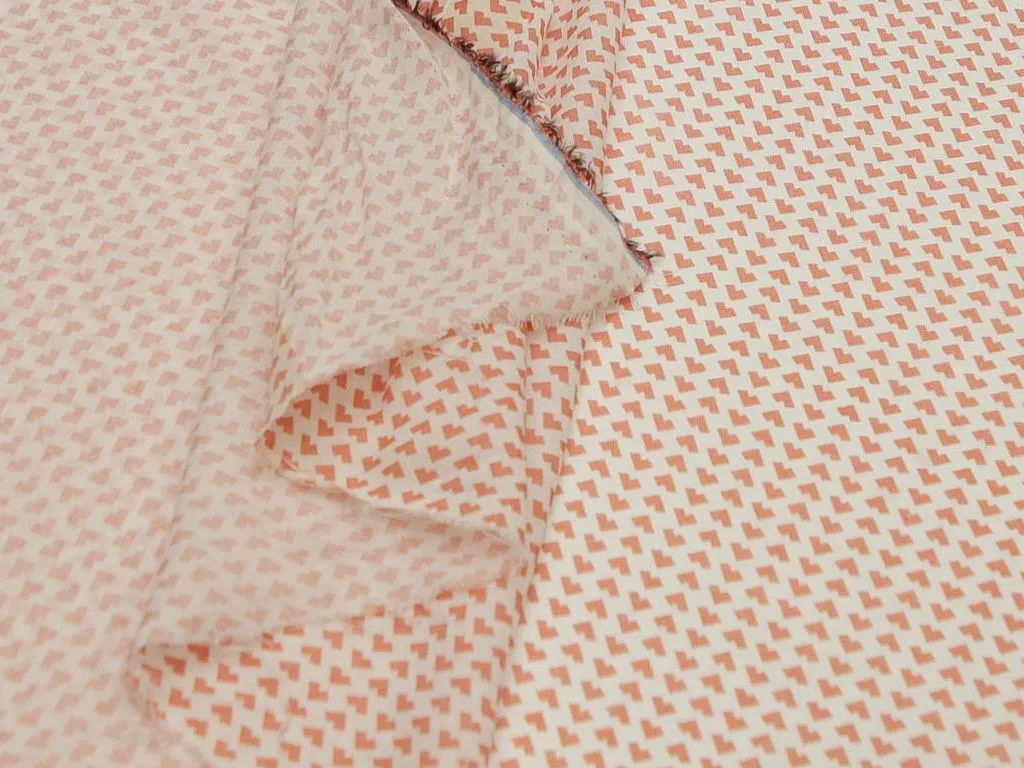 Плательная ткань с мелкии сердечками кораллового цвета на молочном фоне