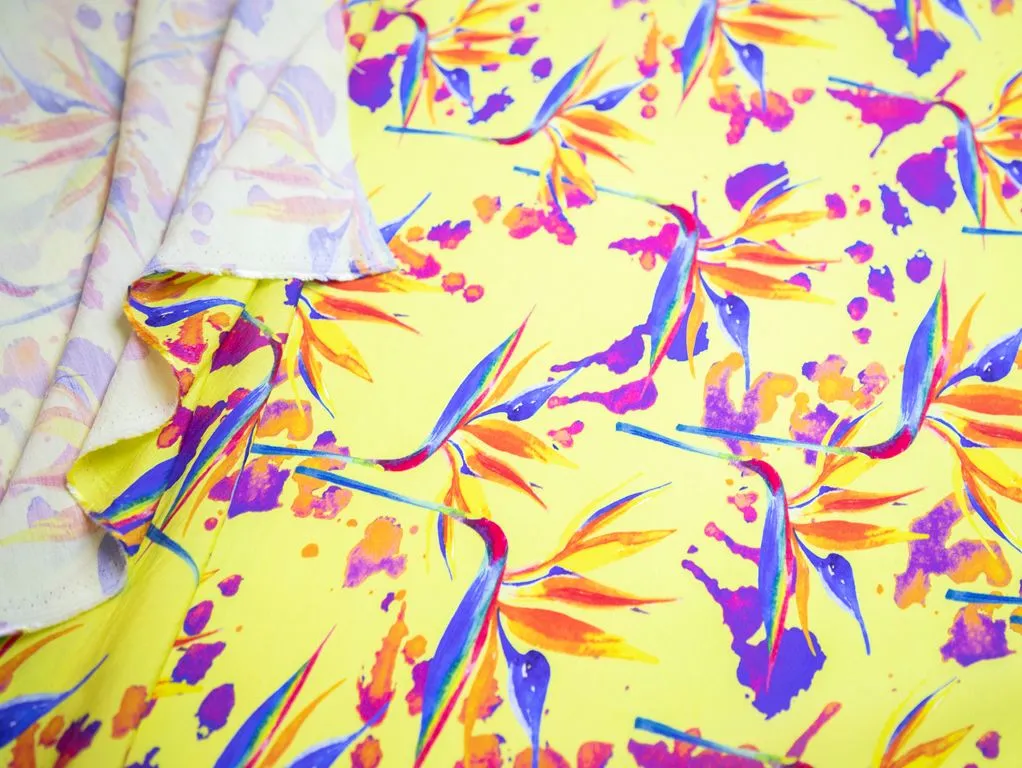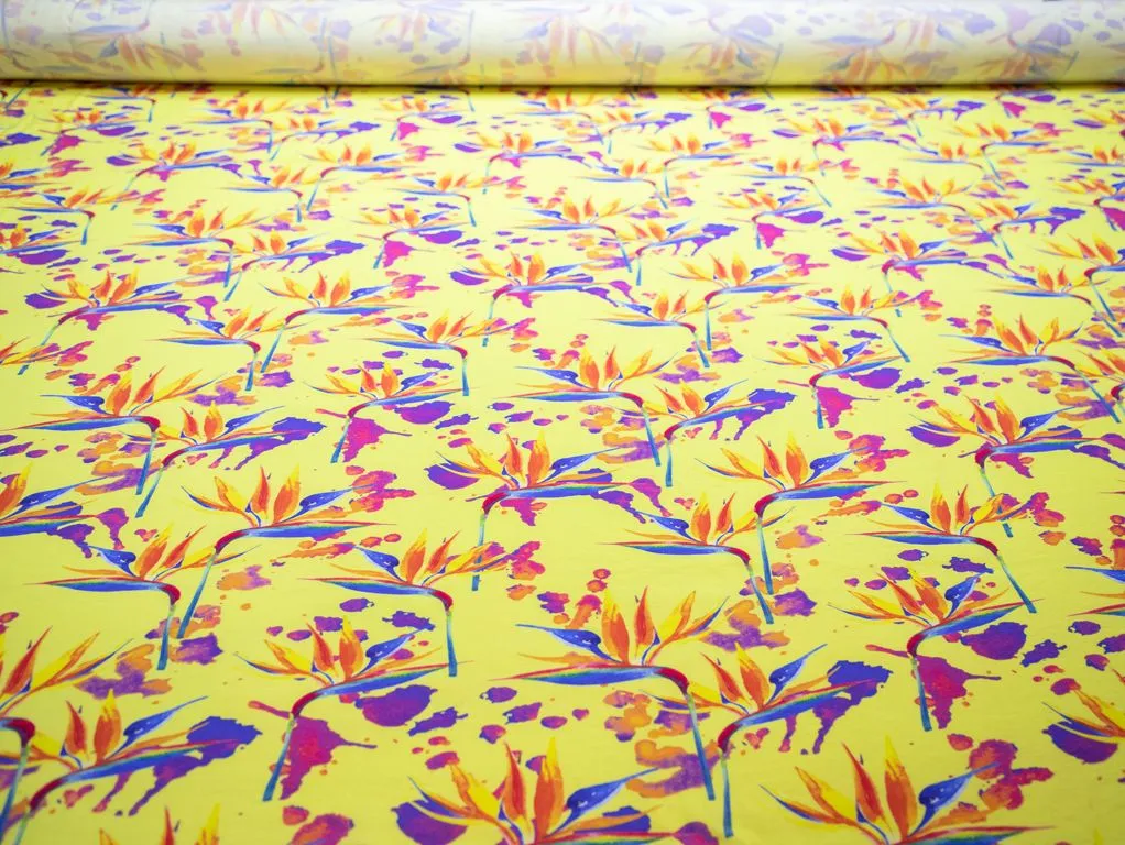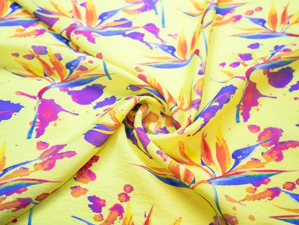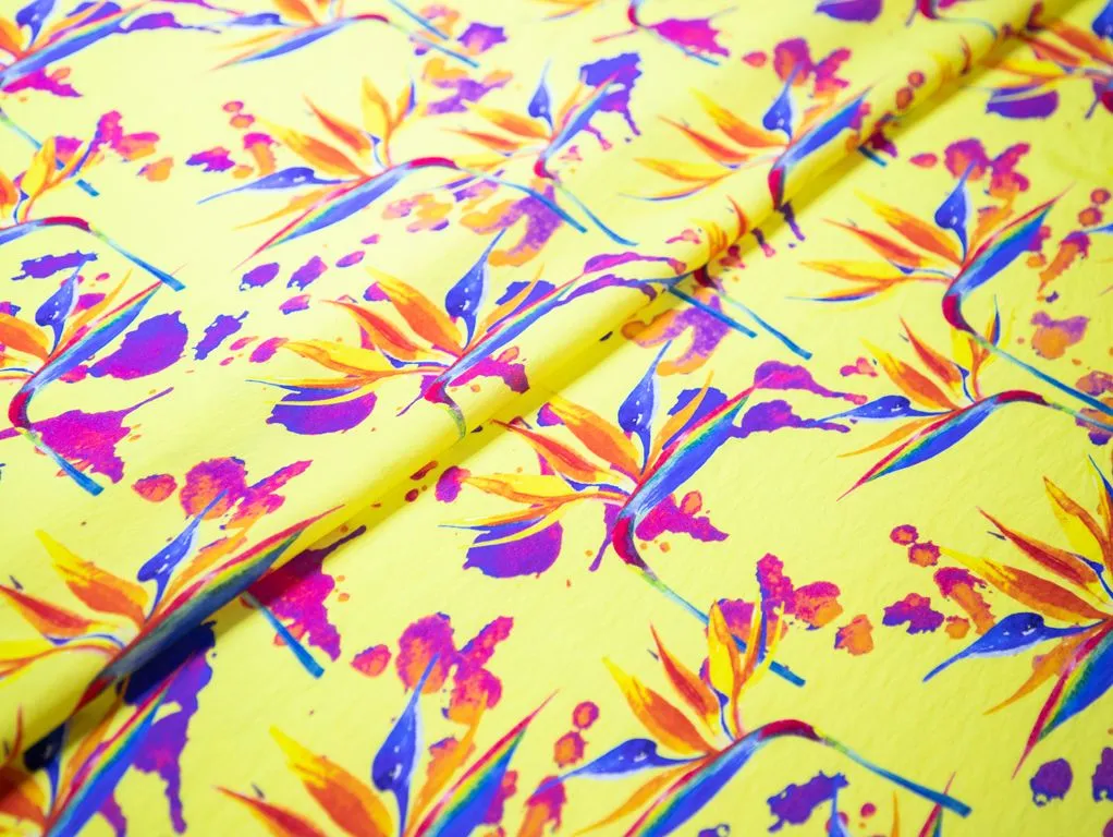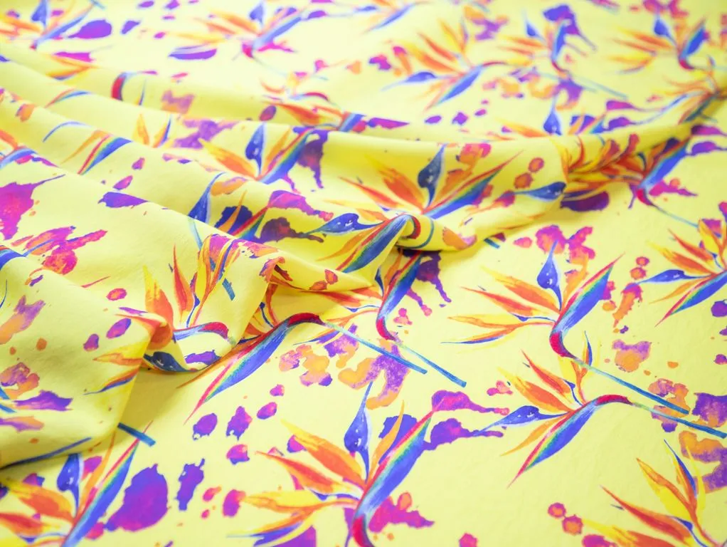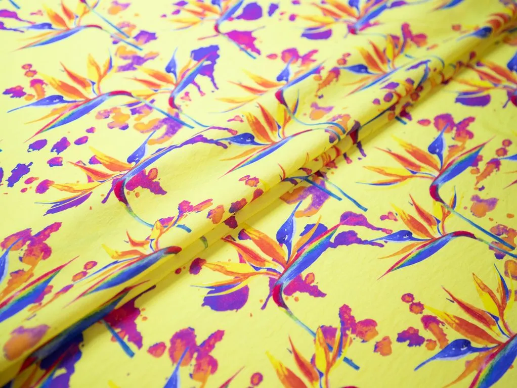 Плательная ткань с рисунком "Стрелиция", фон желтый