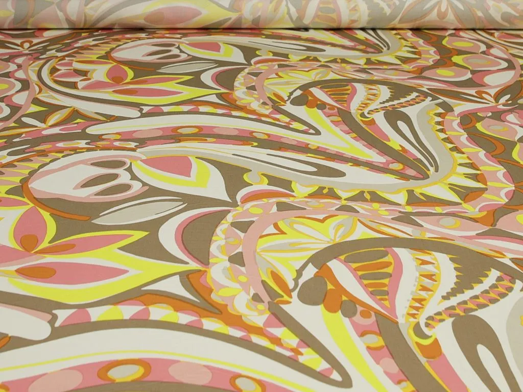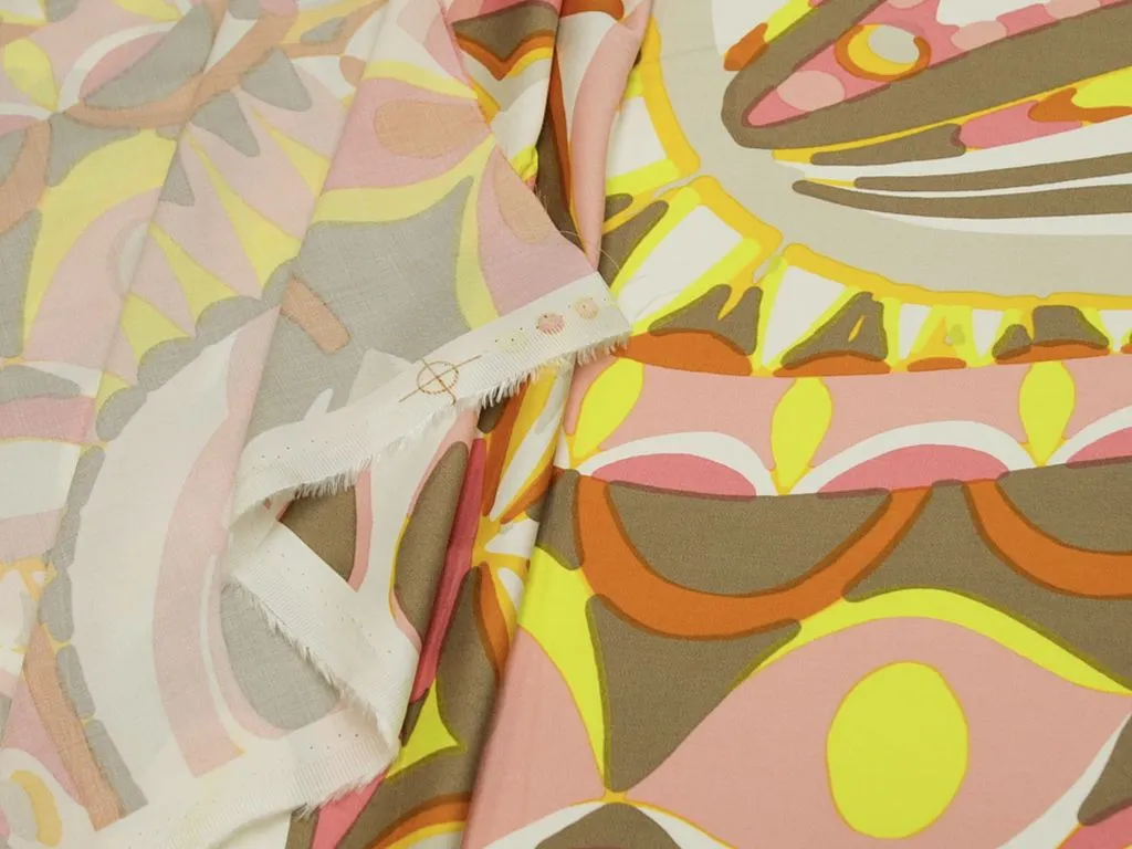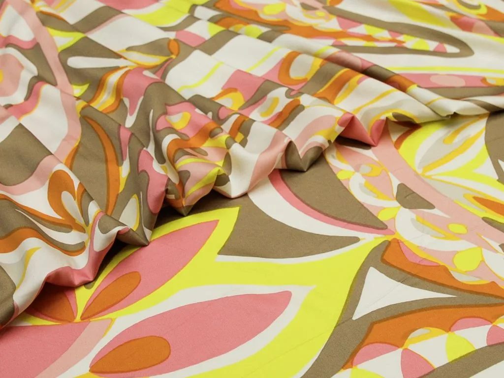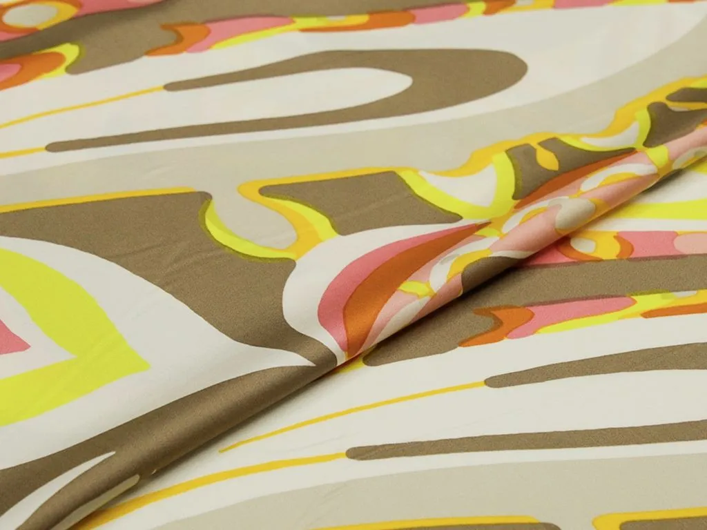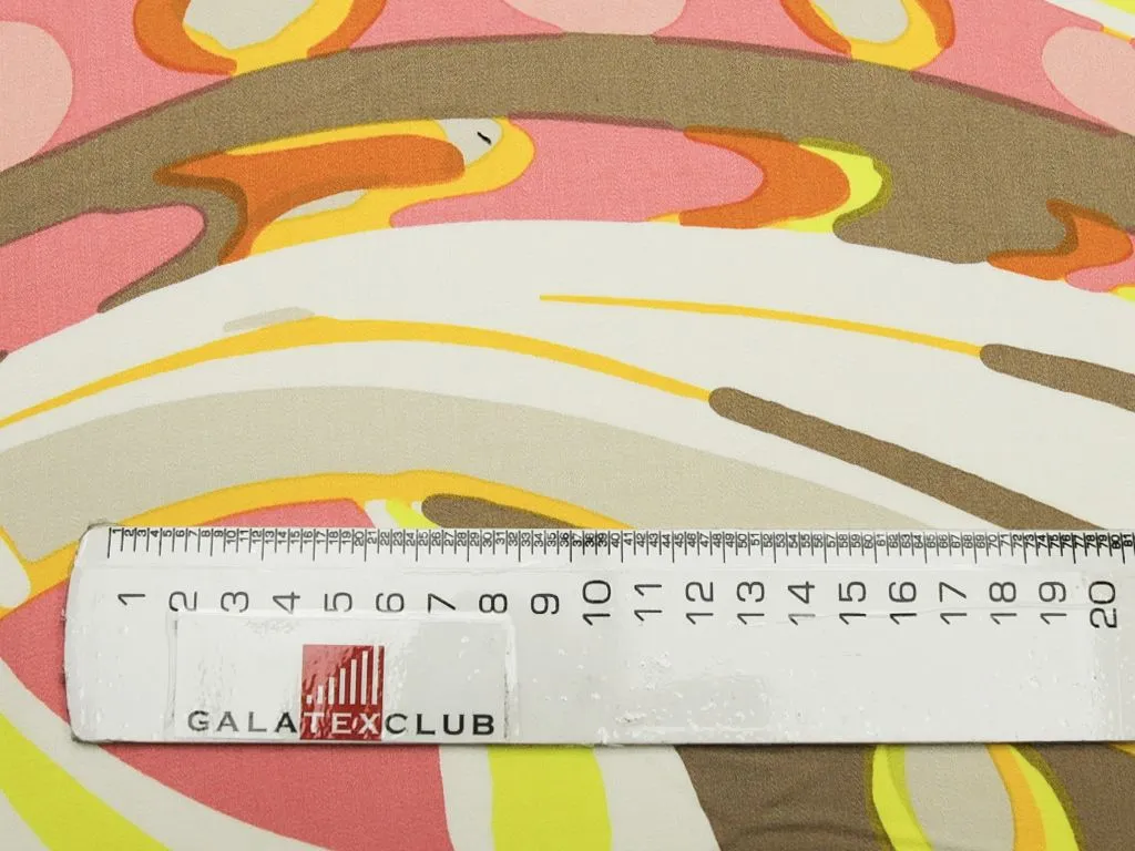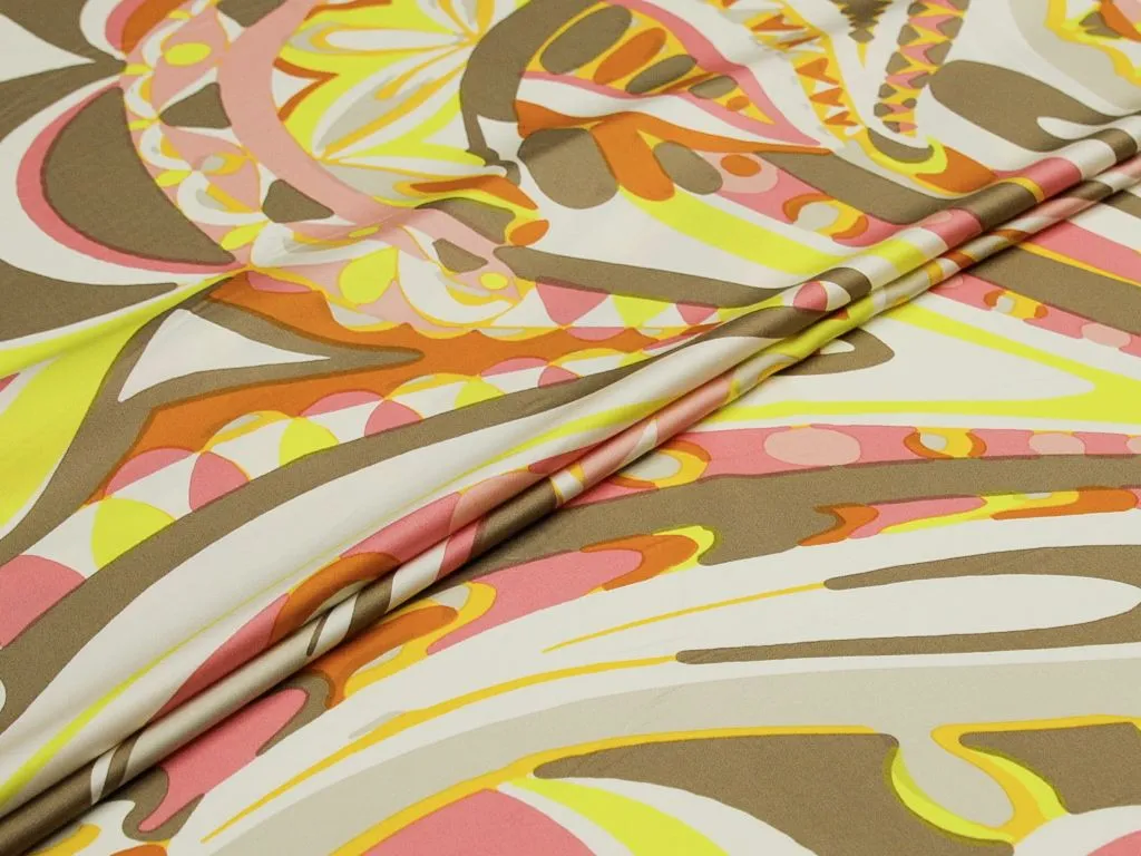 Плательная ткань с ярким принтом в розово-желтом цвете
