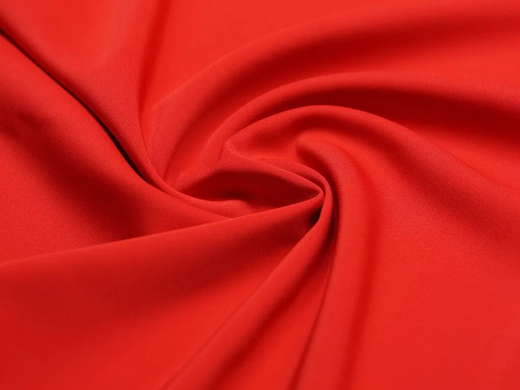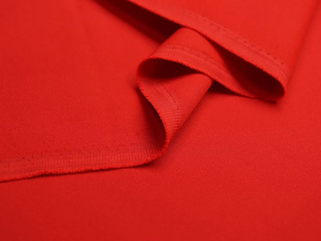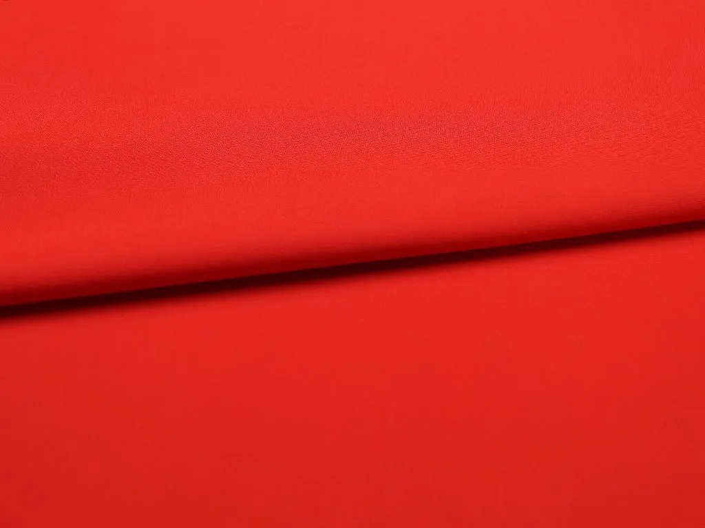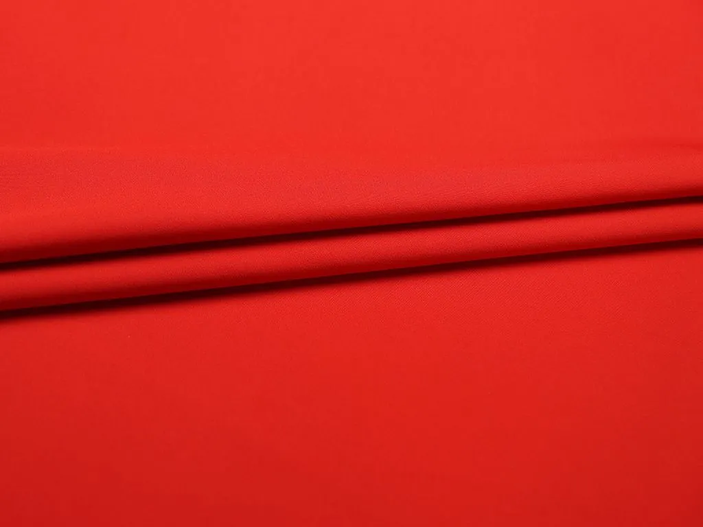 Костюмно-плательная ткань Кади ярко-красного цвета с добавлением эластана. Ткань средней плотности, пластичная, комфортная, не электризуется, на ощупь не сухая, с матовым блеском, очень красива в драпировке. Подходит для изготовления топа, костюма, платья, юбки и брюк.