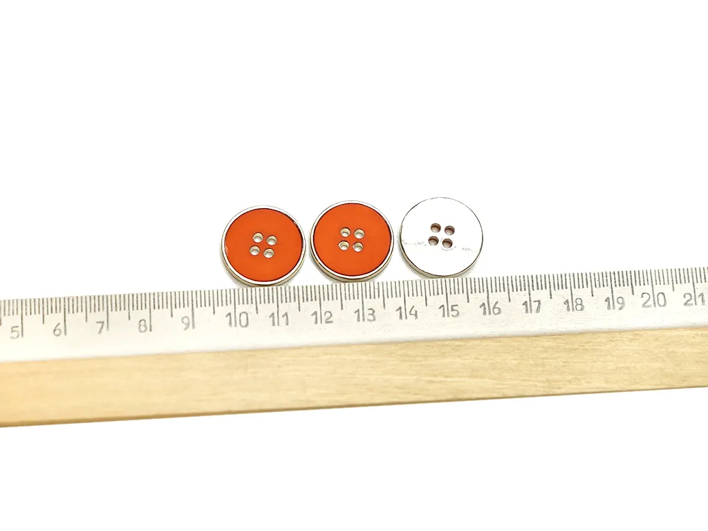Пуговица, четыре прокола, золотой металл с оранжевым пластиком, диаметр 20 мм