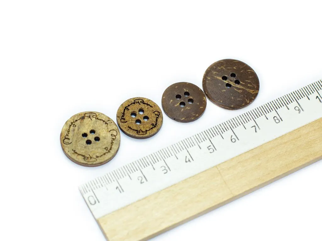 Пуговица кокосовая, костюмная, 4 прокола, бежевый меланж, с надписью, диаметр 18 мм
