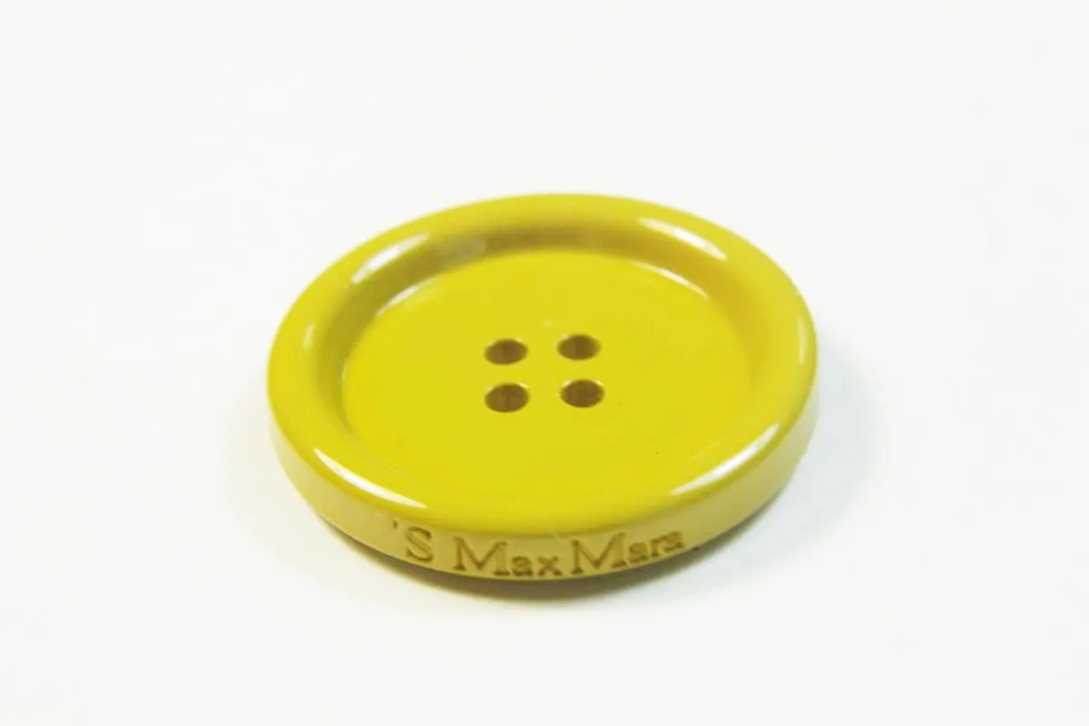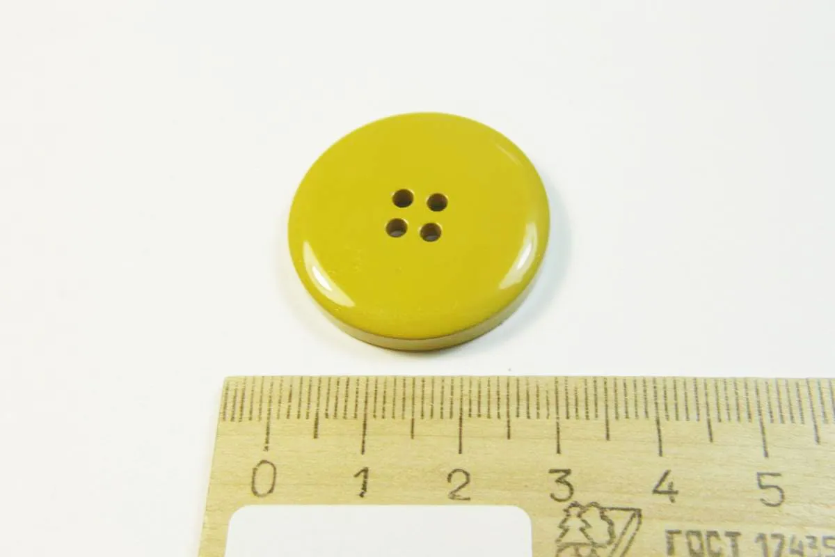Пуговица пластмассовая, четыре прокола, горчичного цвета, диаметр 29 мм