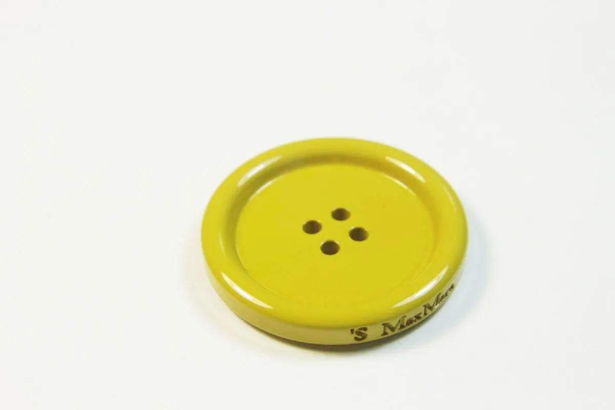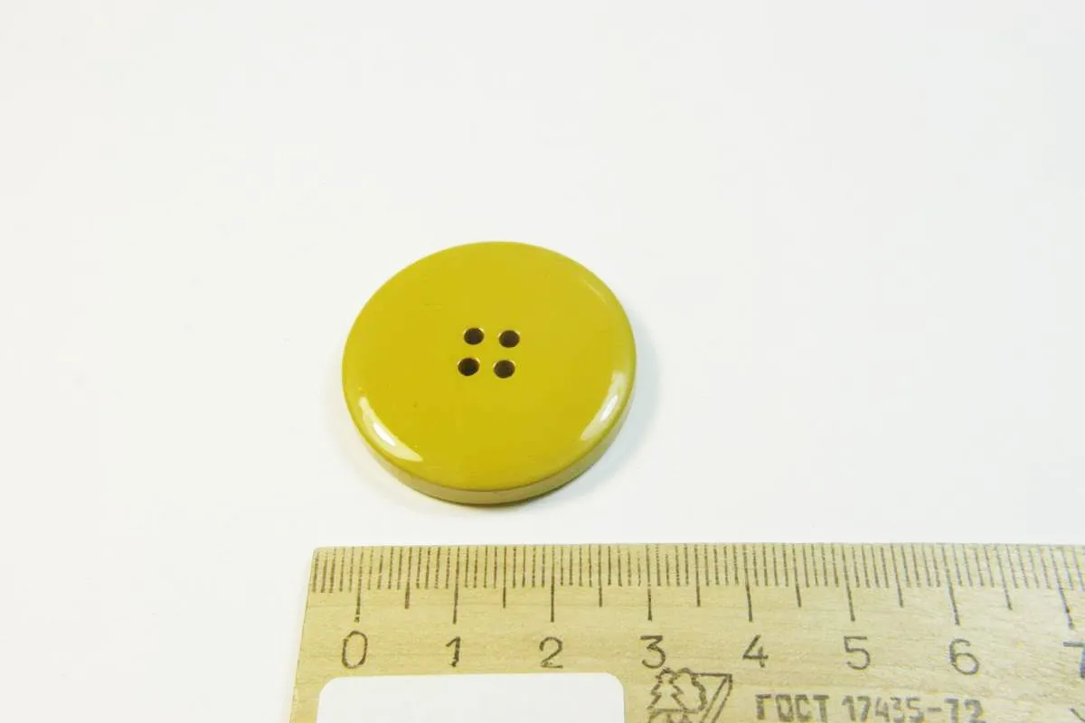 Пуговица пластмассовая, четыре прокола, горчичного цвета, диаметр 33 мм