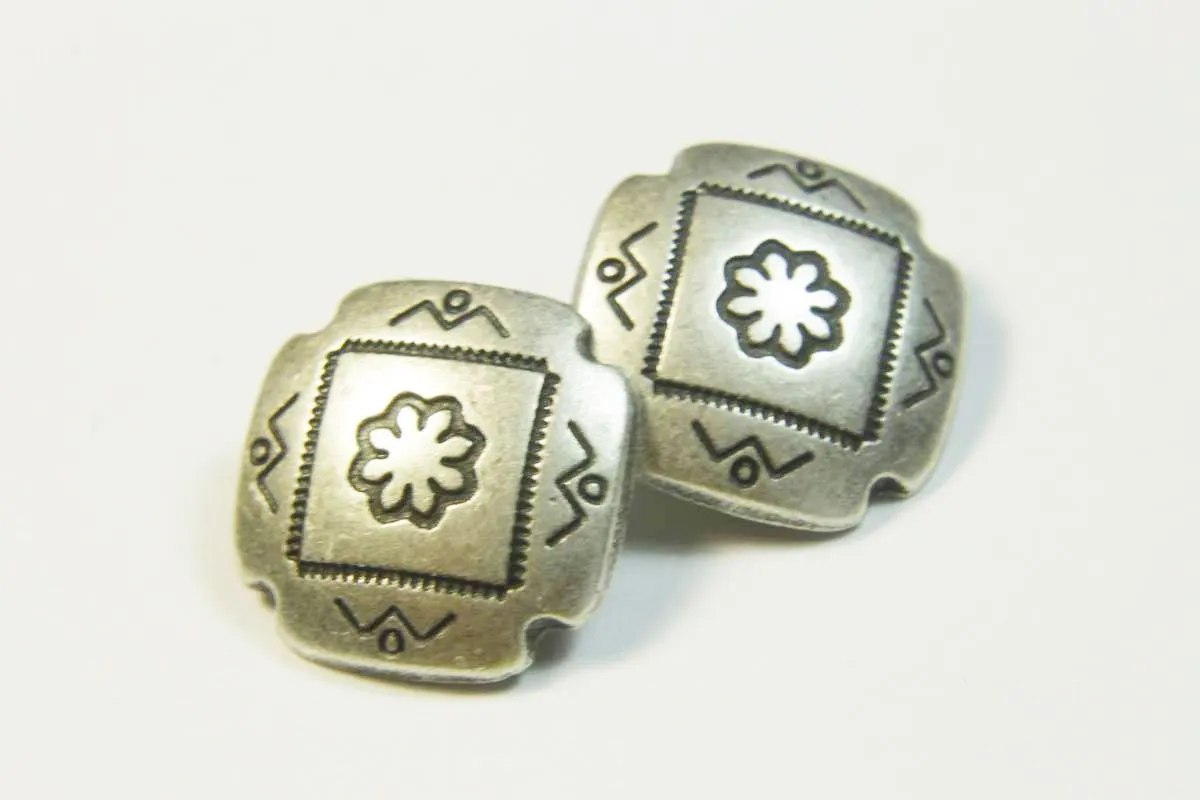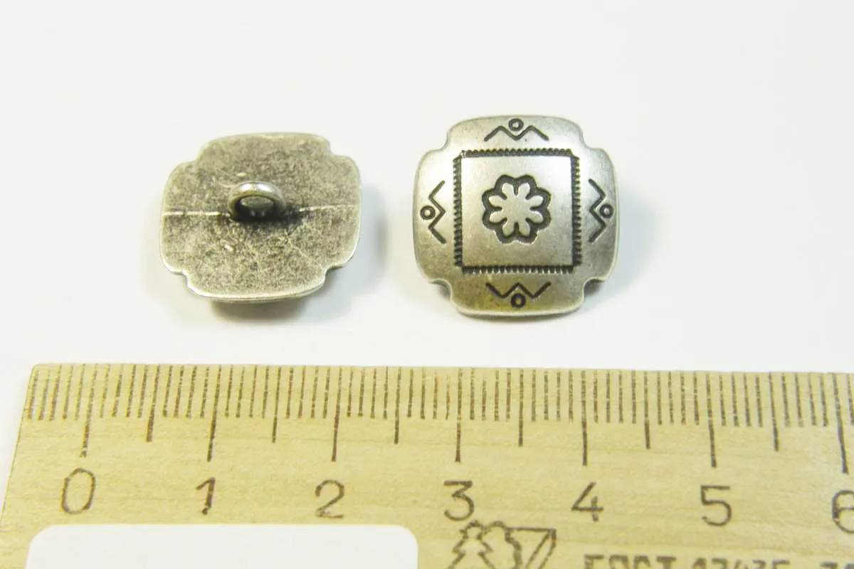 Пуговица металлическая, на ножке, квадратная, цвета матового серебра, с декором. Диаметр 17 мм