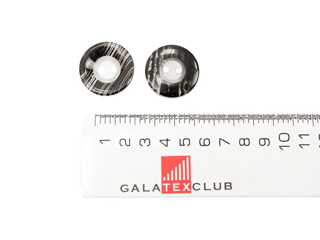 Пуговица пластиковая на пришив, 2 прокола, прозрачная с черными штрихами, диаметр 28мм