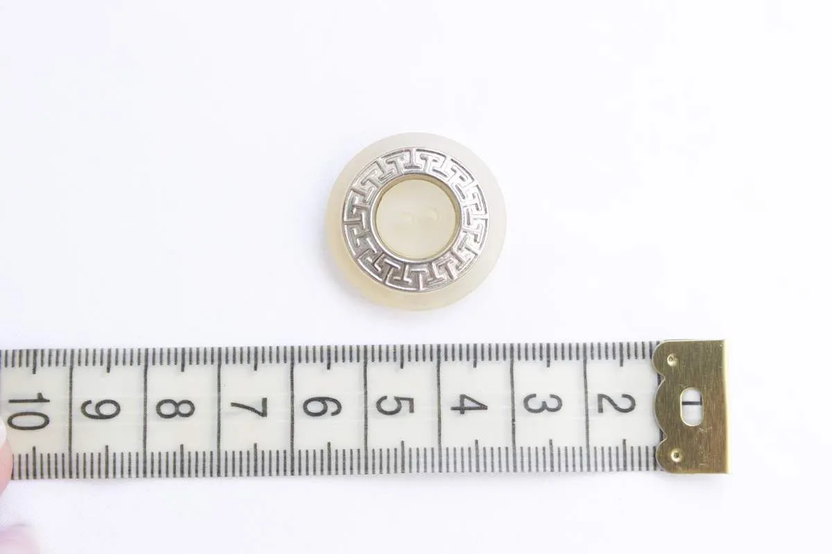 Пуговица пластмассовая, 2 прокола, с металлическим узором, бежевая, диаметр 24 мм