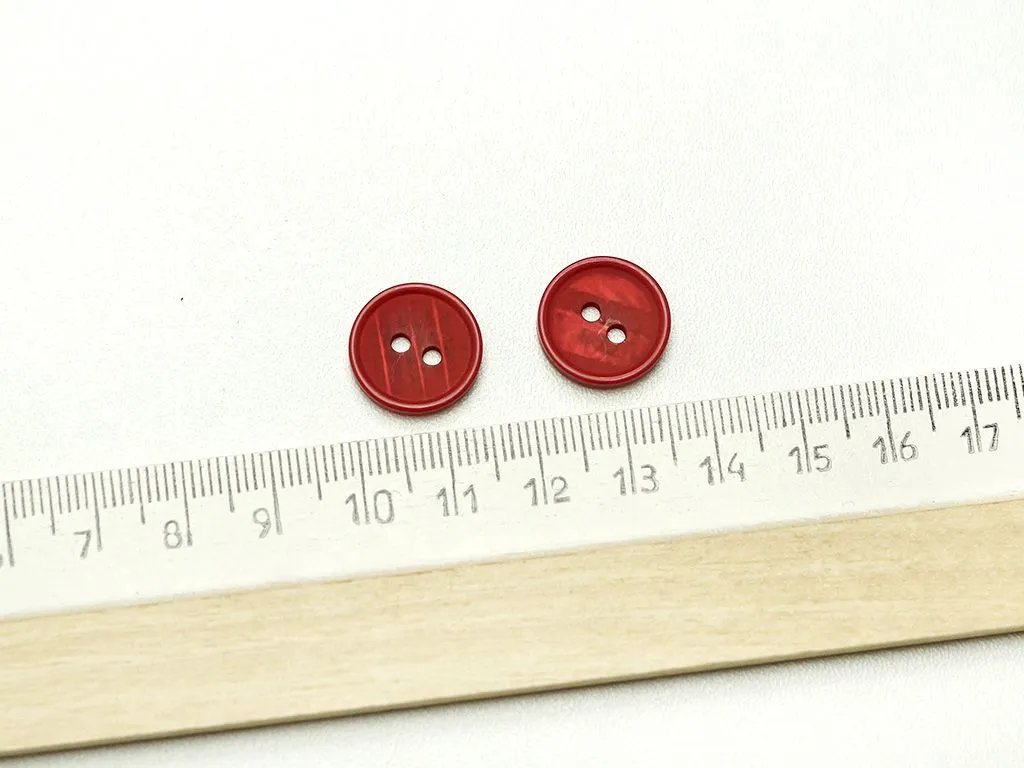 Пуговица пластмассовая, два прокола, красного цвета, диаметр 15 мм