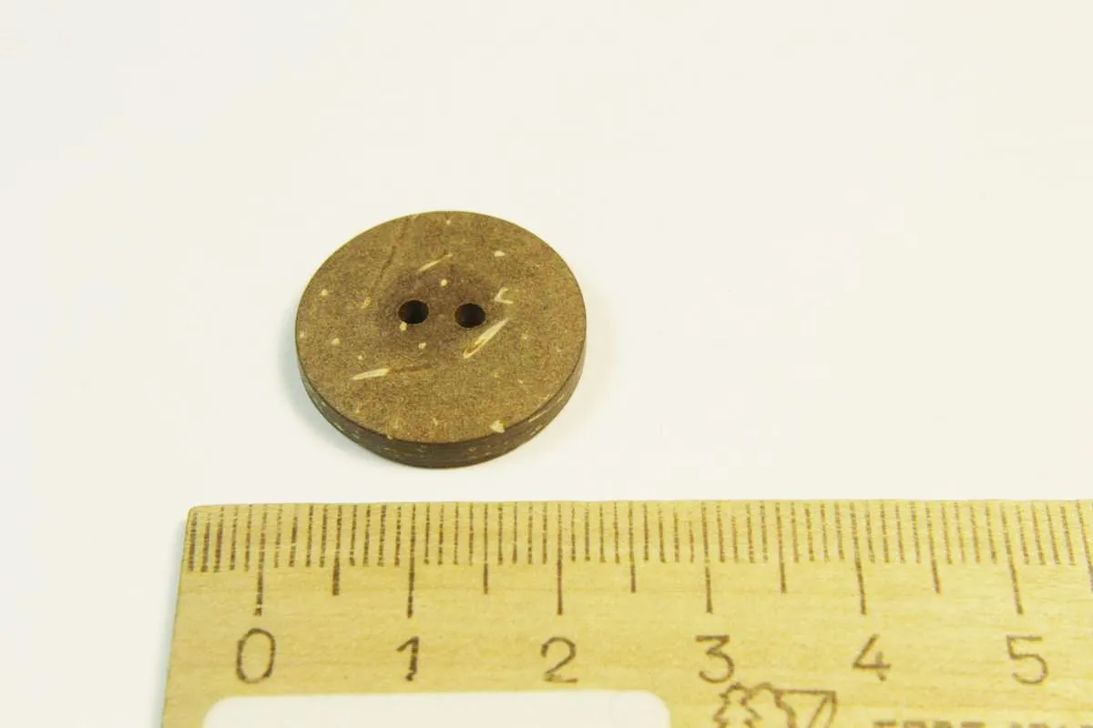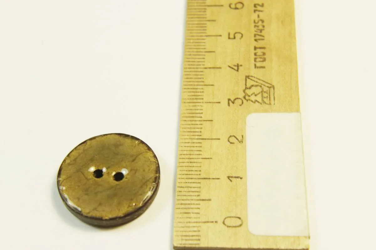 Пуговица пластмассовая, два прокола, пёстрого коричневого цвета, в серой глазури, диаметр 21 мм
