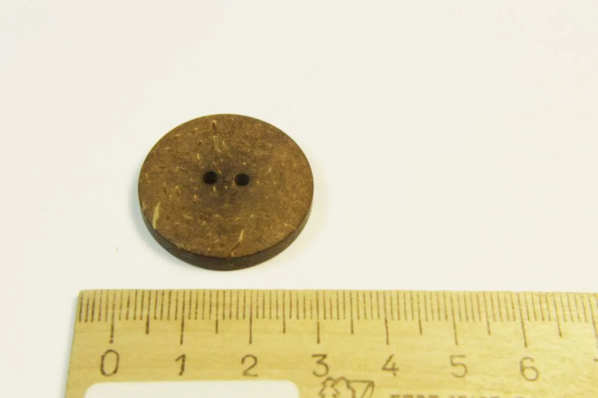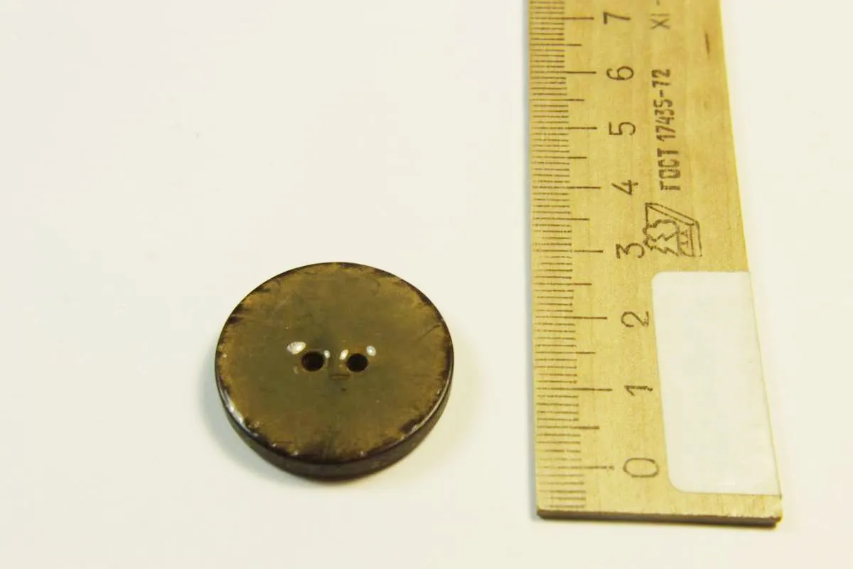 Пуговица пластмассовая, два прокола, пёстрого коричневого цвета, в серой глазури, диаметр 27 мм