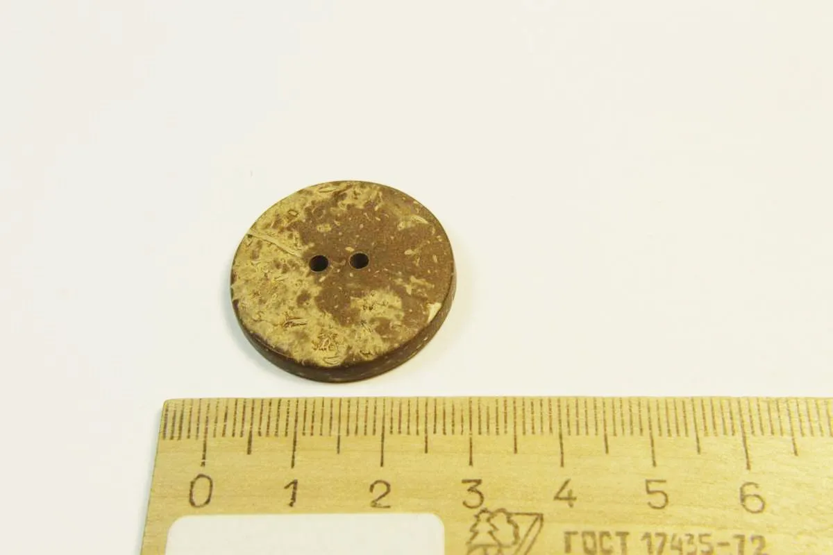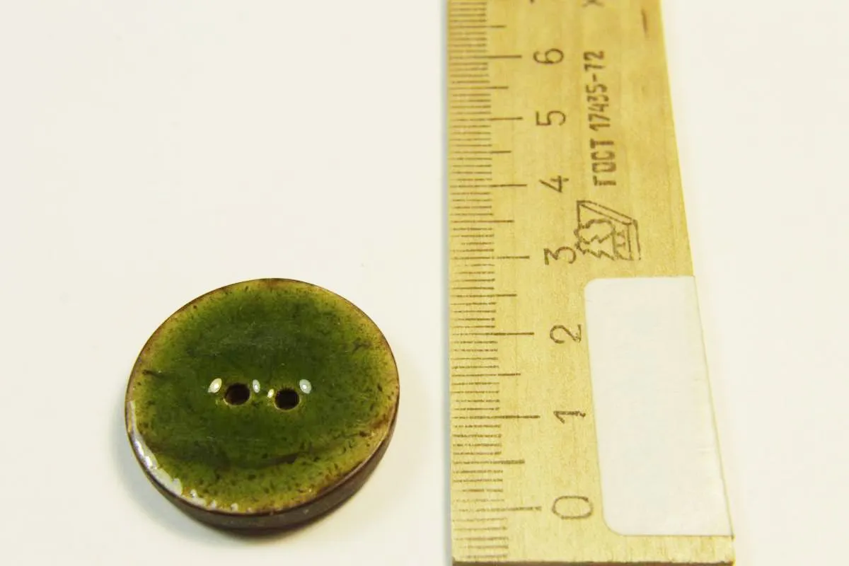 Пуговица пластмассовая, два прокола, пёстрого коричневого цвета, в зелёной глазури, диаметр 27 мм