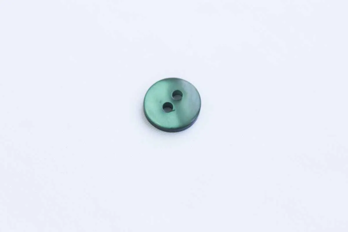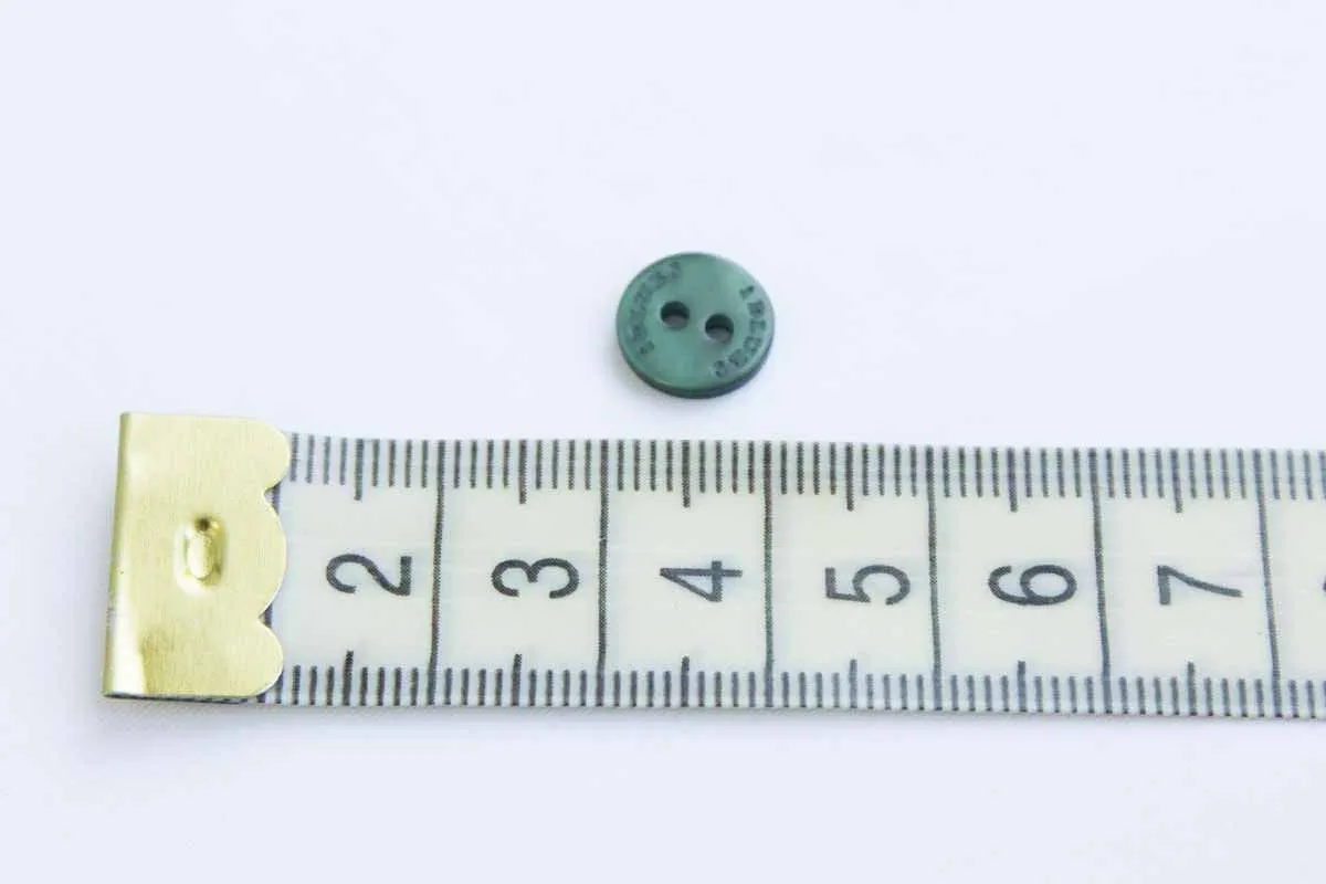Пуговица пластмассовая, два прокола, тёмно-зелёного цвета, диаметр 10 мм