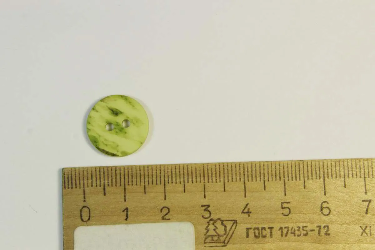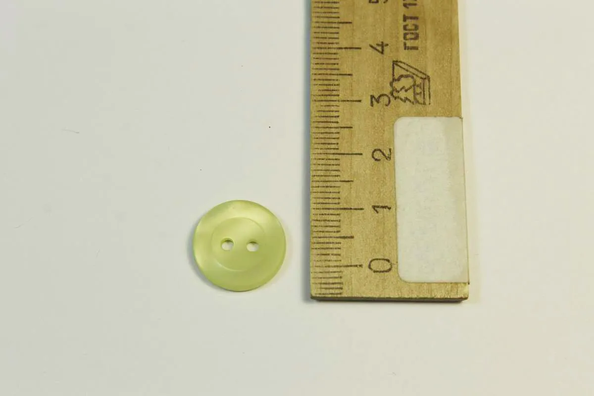 Пуговица пластмассовая, два прокола, зелёный перламутр, диаметр 15 мм