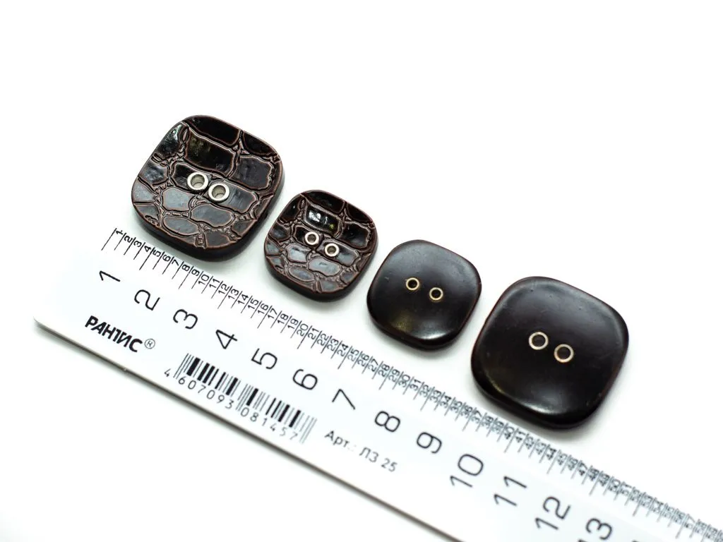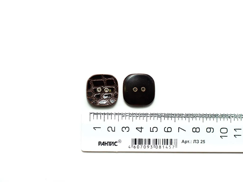 Пуговица пластмассовая, квадратная, 2 прокола, коричневая рептилия, диаметр 23 мм