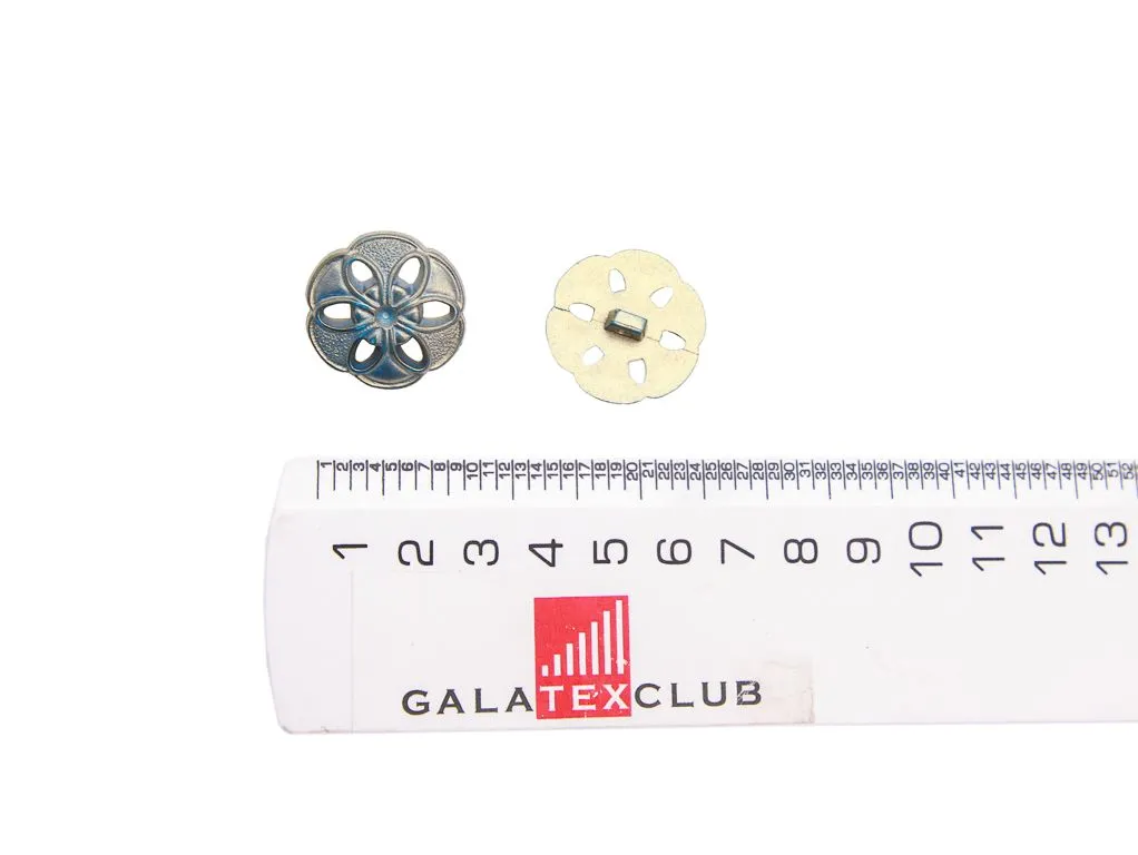 Пуговица пластмассовая, на ножке, ажурный цветок (бронза с голубым), диаметр 24 мм