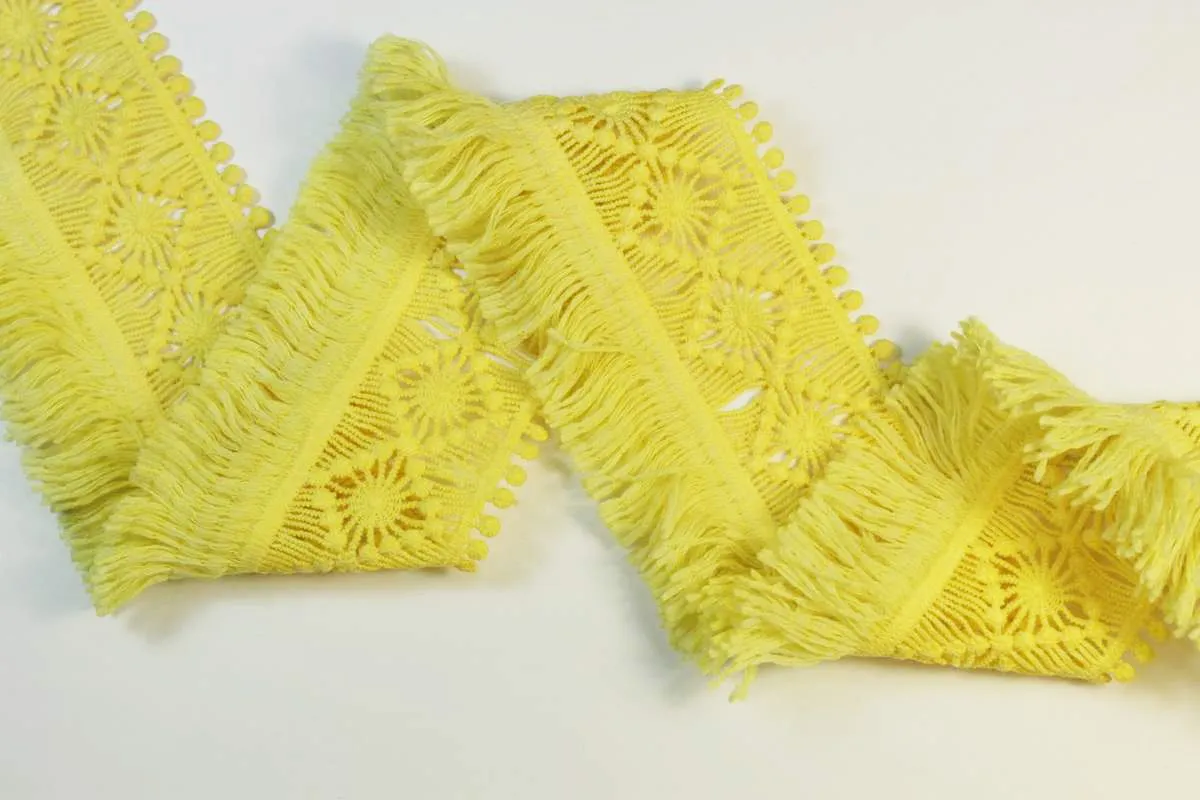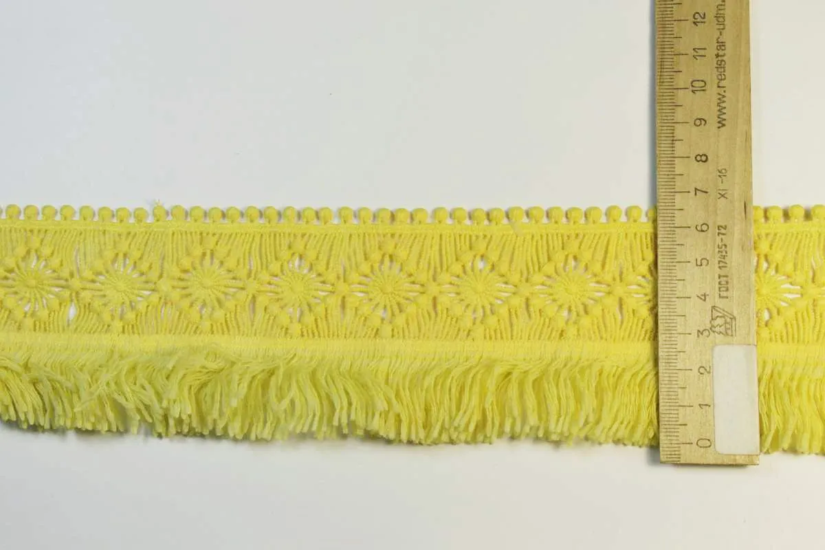 Тесьма декоративная, вязаная с бахромой, светло-жёлтого цвета, ширина 68 мм