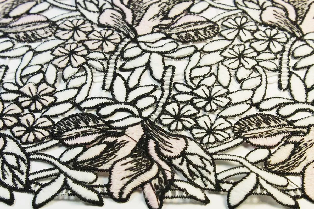 Тесьма-вышивка "Полевые цветы" бело-розового цвета с чёрными контурами, ширина 185 мм