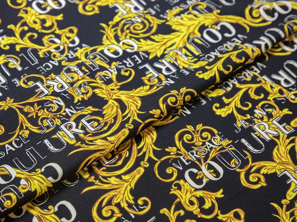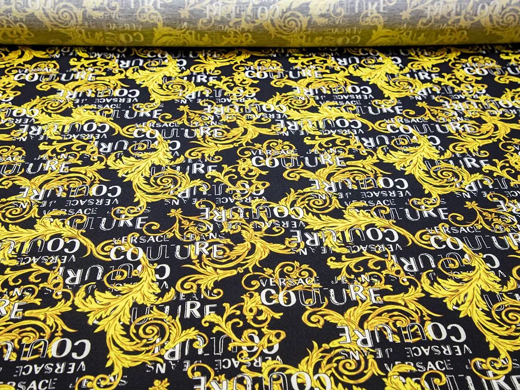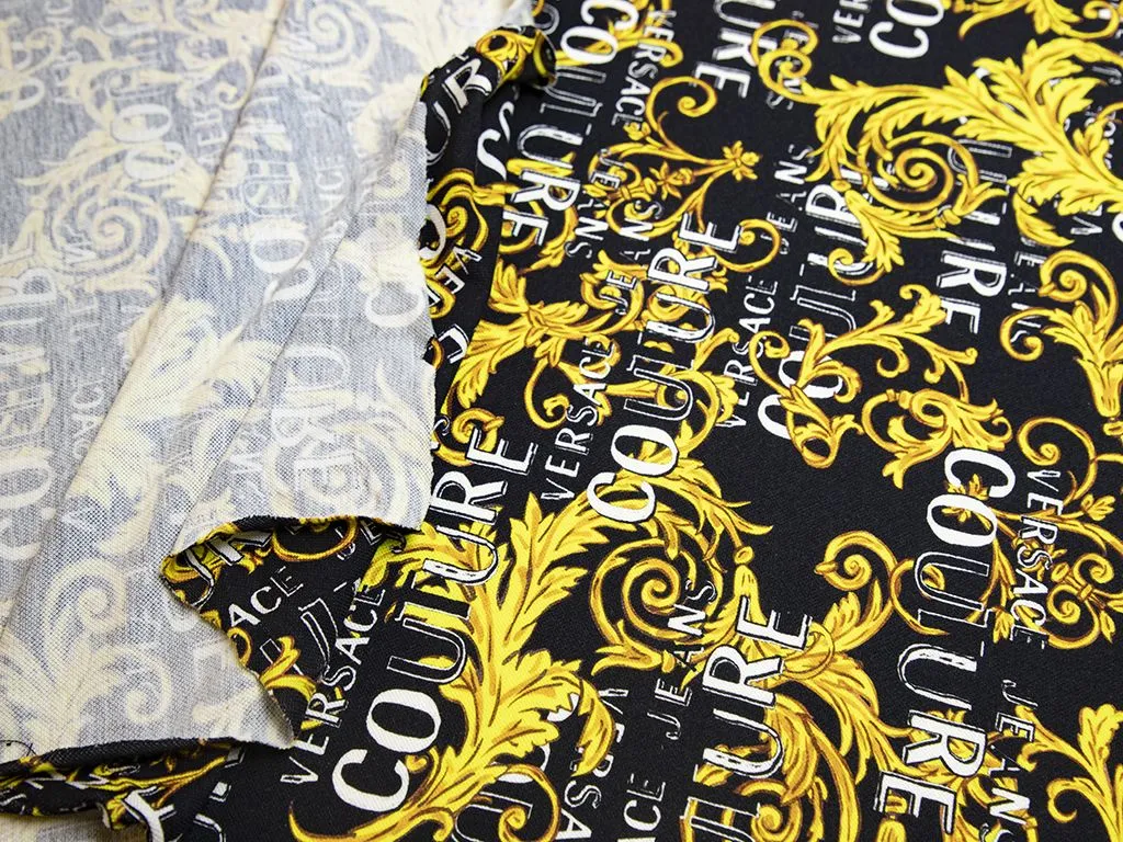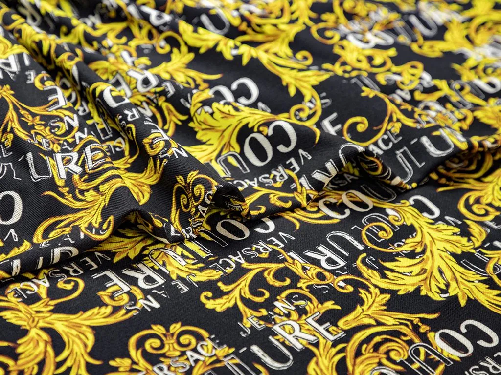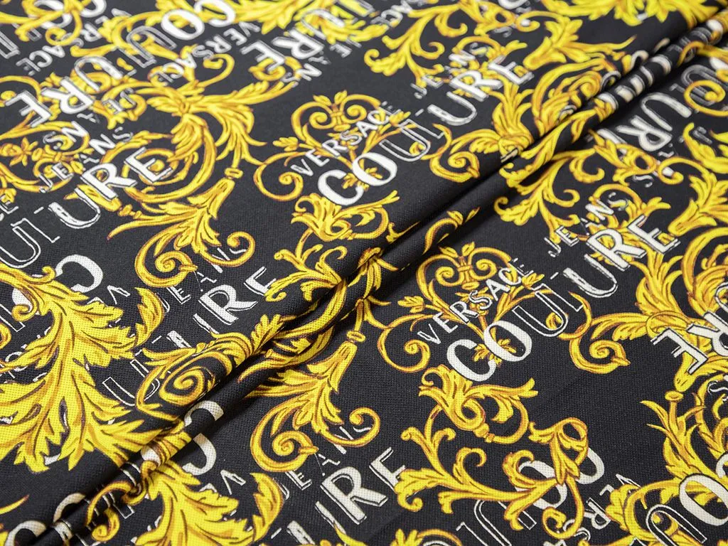 Трикотаж Пике принтованный с надписями, цвет желто-черный
