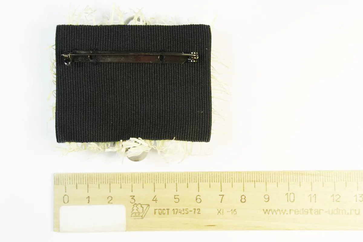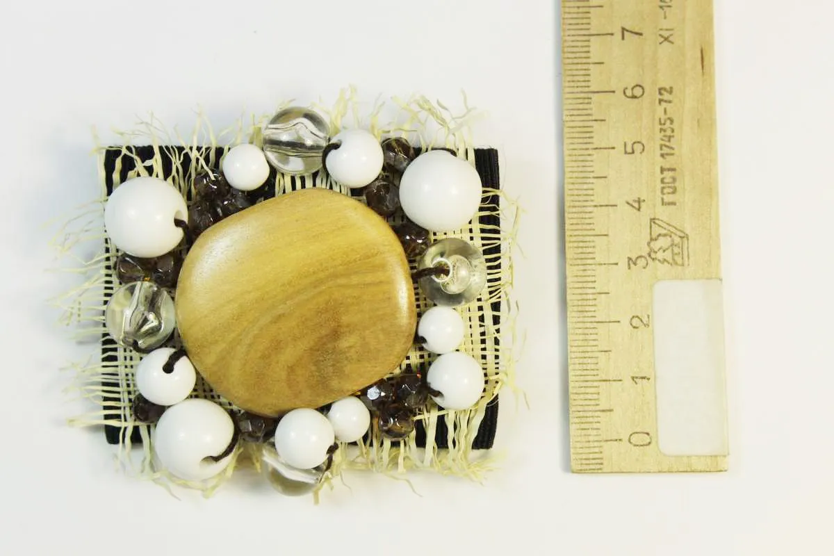 Брошь-украшение, дерево и бусины на репсе, бежевого цвета, 65*50 мм