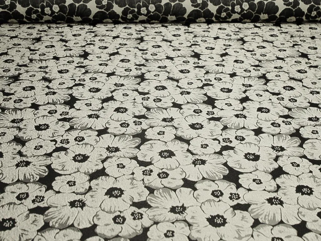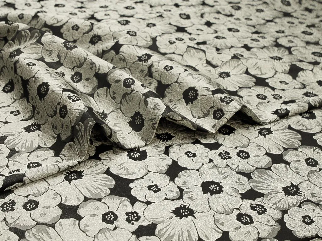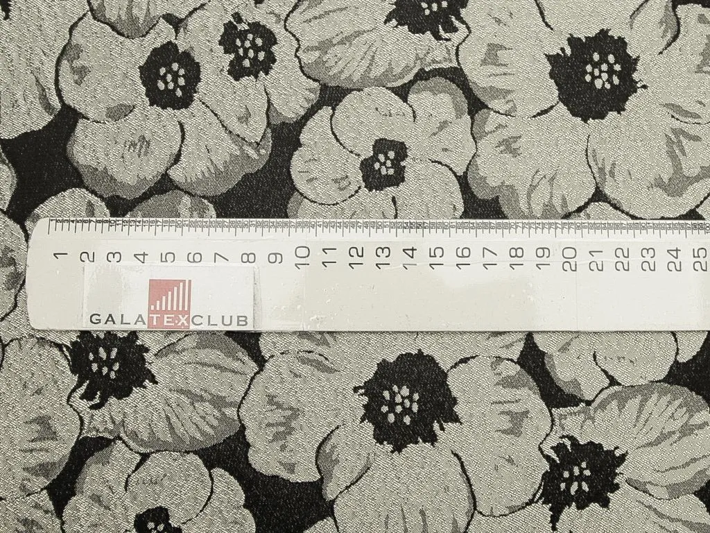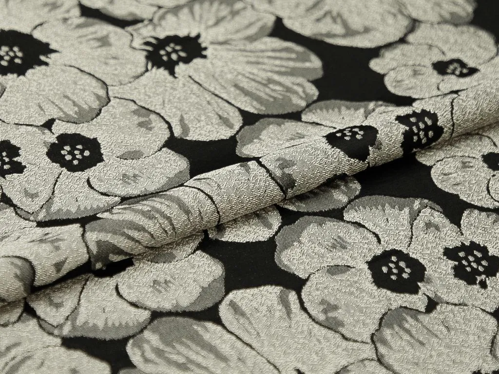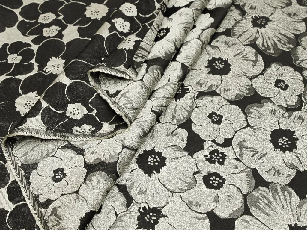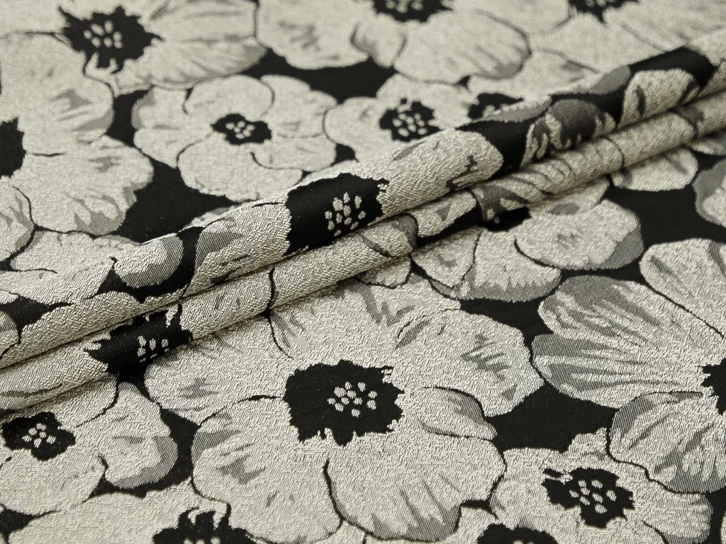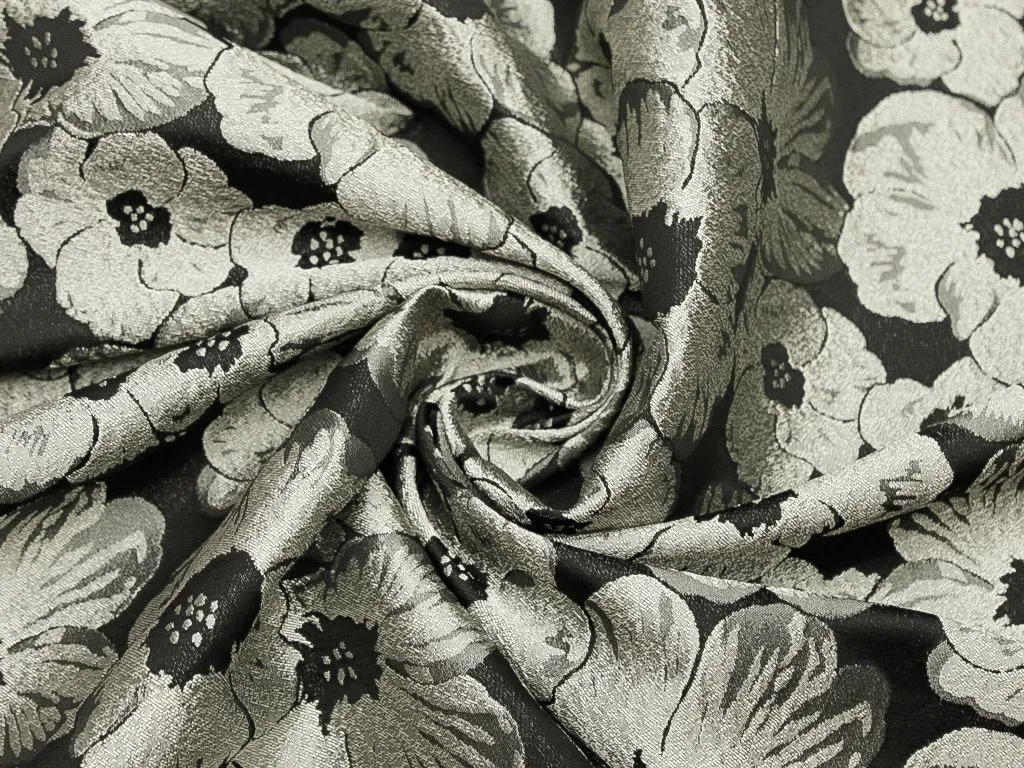 Жаккардовая ткань, серебряные цветы на чёрном фоне
